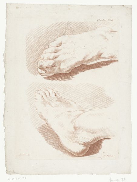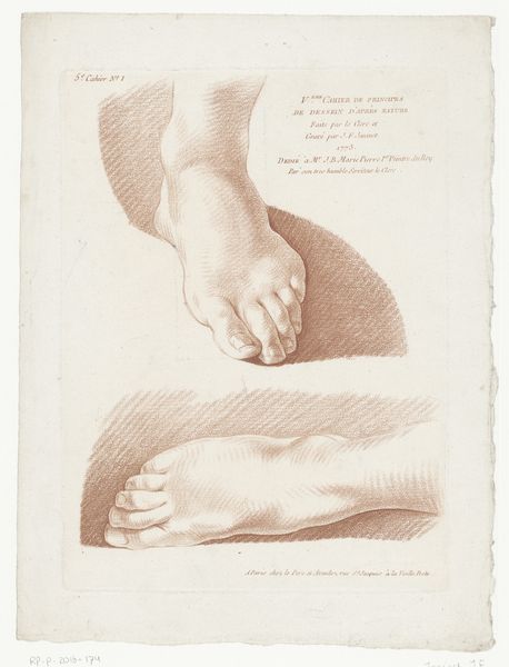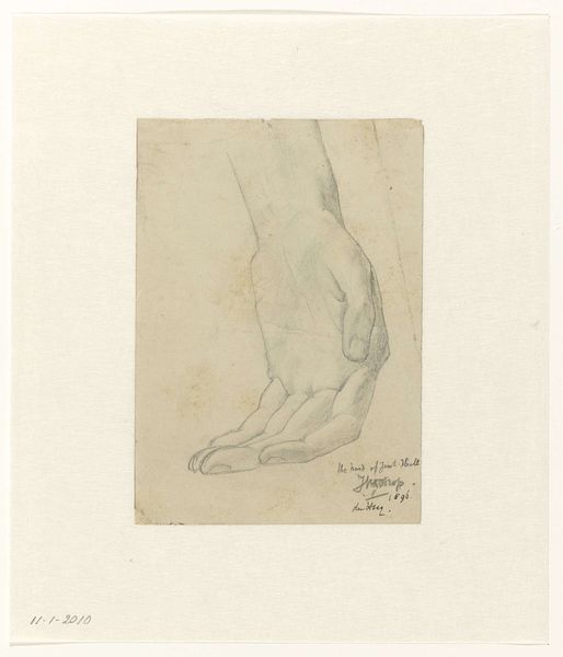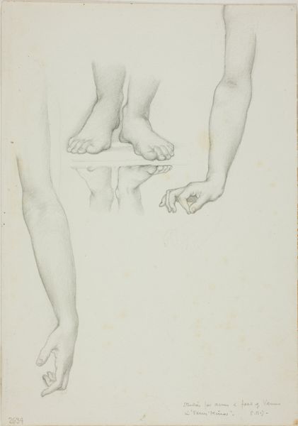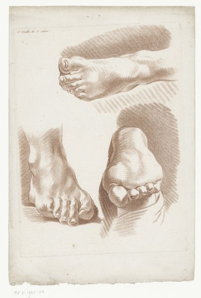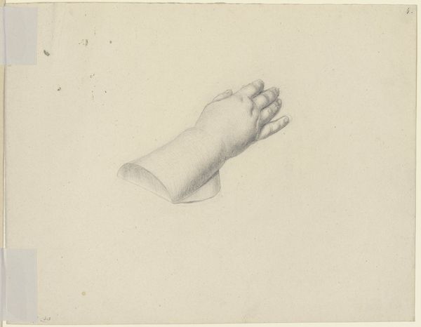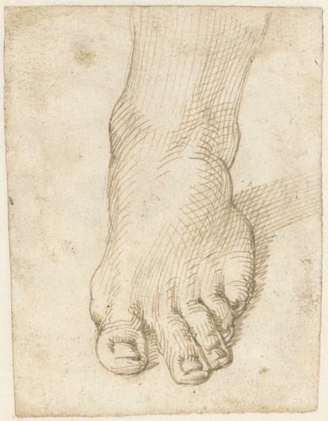 Editor: This drawing, made between 1819 and 1881 by Johannes Tavenraat, is called "Academiestudie naar een gips van een antiek beeld: detailstudie van een voet," which translates to "Academic Study of a Plaster Cast of an Antique Sculpture: Detail Study of a Foot." It’s rendered in pencil, and what strikes me is the intensity of the cross-hatching. What’s your take on it? Curator: What I find fascinating is not the art object itself, but the process it represents and the social context in which it was created. Here we see a record of labor, the repetitive mark-making of the pencil on paper. How does the artist's dedication, even the monotony of the task, influence your perception of it? Editor: It makes me consider the academic training the artist would have undergone. It feels almost like a craftsman learning their trade, through repetition and practice. Curator: Precisely. This connects what’s typically considered "high art" to craft, blurring the lines between them. We can consider the artist's labor, the materials used—the pencil and paper—and the function of the work: training, skill development, and conformity to classical ideals, perhaps limiting true individual artistic expression. How does the social context influence the availability of these materials and, subsequently, artistic development? Editor: That's a good point; access to materials wasn’t a given for everyone. This drawing likely reflects a certain level of privilege tied to accessing artistic training at the time. I hadn’t considered it from that perspective before. Curator: And thinking about consumption, what kind of market existed for these academic studies, beyond their initial use in training? Editor: Maybe a small market among fellow artists, or perhaps collectors interested in the artistic process? It makes you wonder about the intended audience and the artwork's perceived value then. I'm now rethinking what qualifies as art! Curator: Exactly! Considering materiality and social conditions allows for such reinterpretations. Editor: This perspective offers such a valuable lens to question ingrained hierarchies and reassess value within art history. Thanks!