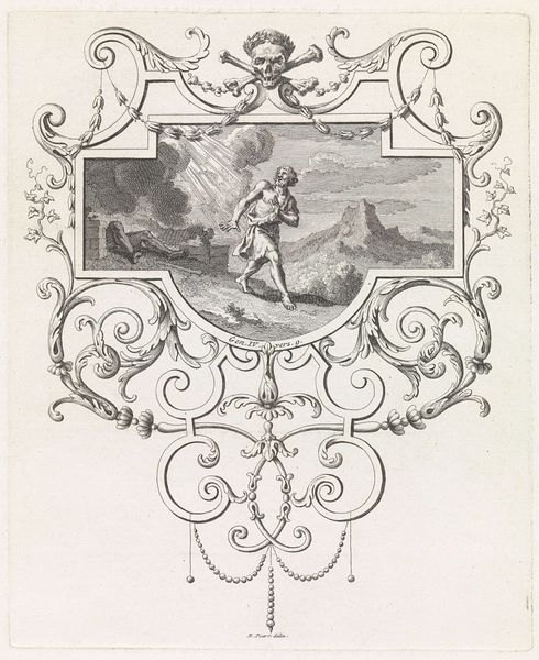 Bernard Picart created this print, ‘Abraham en Isaak offeren de ram,’ sometime between 1673 and 1733. During this period, Europe was experiencing shifts in religious and political power, influencing how biblical stories were interpreted and depicted. Here, we see the story of Abraham's willingness to sacrifice his son Isaac, a narrative laden with themes of faith, obedience, and divine intervention. However, let’s consider the emotional and psychological undercurrents. Isaac, kneeling, embodies submission, while Abraham’s raised arms can be seen as him caught between devotion and internal conflict. The image is framed by elaborate ornamentation, reflecting the aesthetic preferences of the time, yet it also serves to elevate and perhaps idealize this moment of intense personal and religious drama. Picart invites us to reflect on the tensions between faith and reason, obedience and morality, that continue to resonate today.