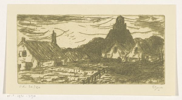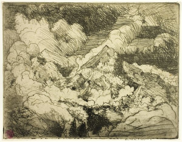 Editor: We’re looking at “The Grimsel” by Donald Shaw MacLaughlan, made in 1908. It’s an etching, printed in ink on paper. The scene feels almost overwhelming with its stark contrast between light and dark. What catches your eye in terms of form and composition? Curator: The distribution of light certainly structures the image. Notice how MacLaughlan uses a dense network of lines to define the shadowy areas, contrasted with the stark white of the paper left exposed to delineate the mountain peaks. How do you perceive the effect of the linework? Editor: I think the lines, especially the varied textures, really create a sense of depth and ruggedness. There’s this chaotic energy in the marks. They’re not just depicting something, they feel like they embody the raw power of nature. Is this roughness intentionally disrupting conventional landscape portrayal? Curator: Precisely. The formal relationships are intriguing, aren't they? He uses the medium of etching to amplify this quality. The plate allows for very fine detail, yet he chooses to emphasize these rough, almost violent marks, rejecting a smooth, picturesque ideal. The materiality contributes significantly to the overall impression. Editor: So, by emphasizing texture and form over strict representation, MacLaughlan elevates the emotional impact of the landscape itself. I’m also now drawn to the upper right-hand side where he etches vertical marks almost mimicking rain or waterfalls that frame the central form in this dark ominous glow. I hadn’t noticed that as much on the first viewing. Thanks so much for this formal approach to this work, it helps clarify MacLaughlan’s technical expertise. Curator: Indeed, appreciating how these intrinsic elements interact allows for a deeper engagement. Focusing on form opens new avenues of interpretation beyond just subject matter.