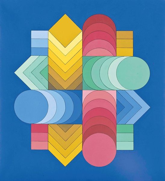 Editor: Here we have Victor Vasarely's "2041-Deuton-GVBR," painted in 1967 using acrylic. It's overwhelmingly geometric. The composition is visually stimulating, almost unsettling, like a trick of the eye. What kind of deeper resonance do you see in this piece? Curator: The geometry acts almost like a modern icon, doesn't it? Notice how the colours and shapes repeat, creating a pattern language. It's a constructed visual code, a matrix that reflects the machine age and our place within increasingly rigid systems. Editor: I see what you mean about a system. The shapes create an implied depth. What do the varying colours suggest to you? Curator: They represent different layers of reality. Perhaps, levels of awareness, or emotional states. Vasarely's work, particularly his exploration of Op Art, is designed to challenge our perceptions, triggering specific psychological responses, making us active participants in perceiving the work. Doesn’t it remind you of city grids, architecture, even computer code? Editor: Yes, especially with the repetition! It does feel digital, even though it's acrylic paint. Were viewers in the 60s supposed to find it futuristic? Curator: Precisely! He explored space and industrialization. Its title implies an aspiration. Editor: So it is referencing the future and where this "repetition of pattern" will take us? Almost like it contains a seed of progress and warning at the same time. Curator: Yes, an intriguing dance between utopia and dystopia, wouldn't you say? The symbolism is both exhilarating and unsettling. Editor: Definitely makes you think beyond the shapes and colors themselves. It's been eye-opening to unpack this with you!