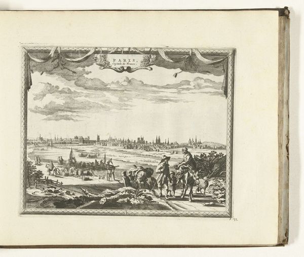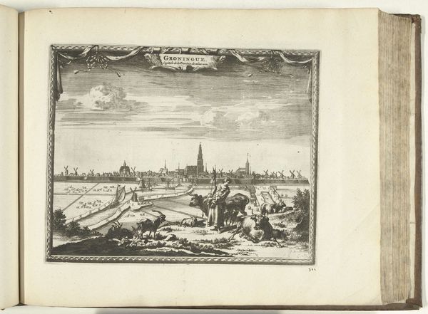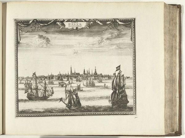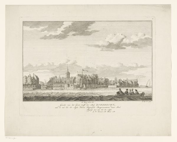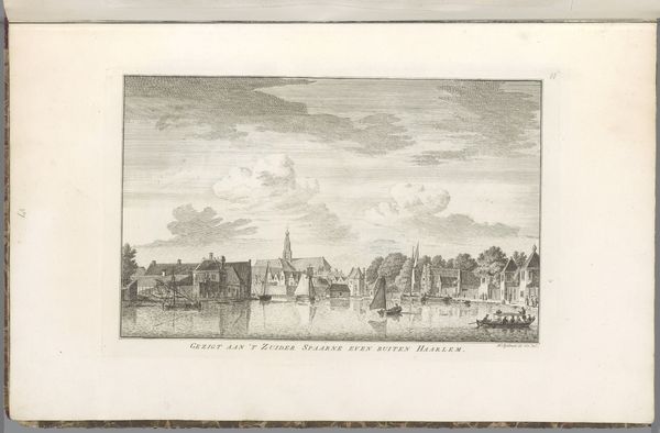Curator: Hendrik Spilman created this etching titled "Gezicht op het Noorder Spaarne" sometime between 1762 and 1763. It's currently held at the Rijksmuseum. My first impression is how airy the composition is. Editor: Yes, the dominance of the sky and water really emphasizes the stillness and expanse of the scene. The delicate linework creates a sense of tranquility, almost like a memory fading into clarity. Do you sense anything beyond the purely representational? Curator: The cityscape itself becomes a symbol, I think, of the Dutch Golden Age—a testament to prosperity and industry rendered through idealized vision. The church spire piercing the sky—note its centrality—underscores the deep spiritual foundation of that era. And that windmill; a constant reminder of human ingenuity adapting nature’s powers for progress. Editor: I'm drawn to the arrangement of these visual elements—the calculated placement of each boat, each building, even the clouds. They structure the entire image, using horizontals to guide the eye. What do you think is the impact of Spilman's strategic perspective? Curator: The evenness of the scene feels significant. It doesn’t offer a dramatic narrative, rather presenting an almost self-consciously balanced and harmonious world, reassuring in its stability and purpose. This visual choice might be interpreted as Spilman commenting on a collective yearning to continue thriving—to maintain the status quo. Editor: Well, beyond historical interpretations, it’s a brilliant essay in contrasts—solid architectural forms juxtaposed against the fluid reflections in the water, the ordered skyline playing off against the somewhat wilder brushstrokes suggesting the clouds. The whole is meticulously calibrated to produce this overall effect of harmony. Curator: It truly prompts us to consider how we continue building upon the foundations of the past, remembering both the ideals and the realities. Editor: It certainly encourages you to appreciate the formal elegance embedded within even a seemingly simple landscape print.
