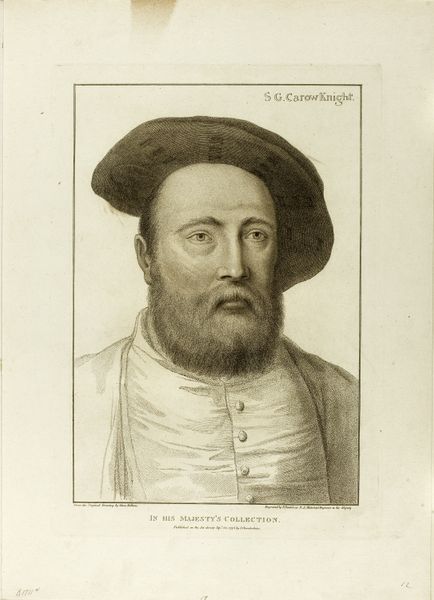 Curator: I'd like to draw our listeners' attention to this piece entitled "Ormond," a portrait dating back to 1794-1797. Francesco Bartolozzi rendered this print, a meticulous engraving on paper now held in the Art Institute of Chicago's collection. Editor: It has this lovely sepia tone—a certain aged dignity comes to mind. It makes you feel like you're uncovering something from the past. The sharp, clean lines are remarkable, especially considering it is an engraving. You get a very palpable sense of texture of fabrics as well. Curator: Texture indeed, achieved by remarkably intricate and deliberate mark-making. Beyond the texture, the clothing, particularly his cap and distinctive garment— perhaps an indicator of status or rank, point toward symbolic representations of identity. Notice the way the engraver paid careful attention to shadow and light. Editor: That focus on texture does reveal how integral skilled labor was for this style of art and even to portraiture at the time. Engraving took time and precision. Was it common for engravers to recreate or work from existing portrait paintings? It feels like we are looking at a copy, of something grander. Curator: Indeed, printmaking played an increasingly pivotal role in disseminating images and ideals of notable figures, making art more accessible but also crafting narratives for a wider audience. The "Ormond" we see here likely reproduced a painted portrait, extending the subject's reach. The very inclusion in "His Majesty's Collection," proudly stated on the print itself, confirms the cultural significance attached. Editor: That mention of "His Majesty's Collection" gets to the heart of it! Mass production means it’s ultimately tied to consumption and, in this instance, royal endorsement. Even a simple portrait carries embedded ideologies when we examine its modes of production and its ultimate purpose. Curator: Precisely. It invites us to contemplate how representation—visually and materially—shapes our perceptions and perpetuates collective memories. What impressions, do you imagine, "Ormond" sought to convey through distribution? Editor: Perhaps a sense of refined artistry married to controlled replication—the dignity of craft serving imperial purposes? An interesting dialogue to ponder. Curator: Indeed, this work provides such avenues for thought. A humble image on paper carrying weight, not only through the hand of the engraver but with cultural and historical memory, preserved and disseminated for centuries to come.