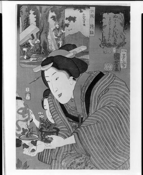 Curator: The chill jumps right out at you, doesn’t it? Editor: It does. This is Utagawa Kuniyoshi’s woodblock print, "Oh How Cold!" part of his "Propitious Products of Mountains and Seas" series, currently held at the Harvard Art Museums. The woman's expression says it all. Curator: Absolutely. I’m immediately drawn to her hands pressed against her mouth, trying to generate warmth. It's such a universal gesture, isn't it? We all know that feeling. Editor: The landscape behind her offers a symbolic counterpoint. The workers on the beach suggest endurance, a connection to the harshness of nature. It's a contrast between indoor comfort and outdoor labor. Curator: A tension, yes! The beautiful floral kimono juxtaposed against that bleak beach scene... it makes me wonder what her life is like. Is she longing for something else, or grateful for her relative warmth? Editor: Her gesture also speaks to a cultural ideal of feminine composure, maintaining beauty even in discomfort. Kuniyoshi captures a complex moment here. Curator: It’s fascinating how a simple image can hold so much. Even centuries later, we still feel that shiver. Editor: Indeed. Kuniyoshi's work continues to invite us to contemplate the layered meanings embedded within everyday moments.