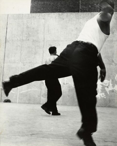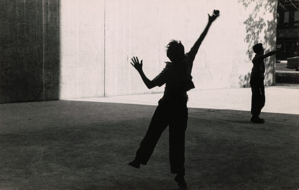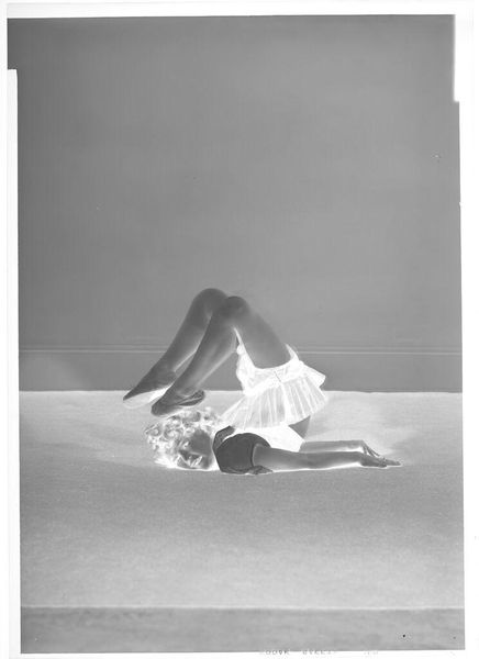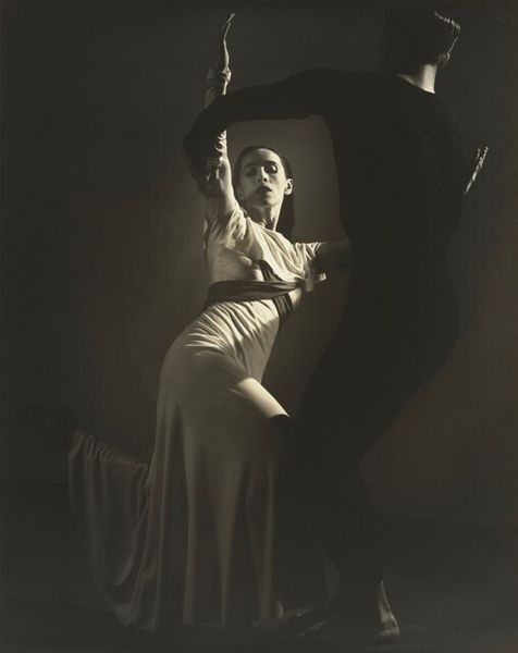 Editor: This is Barbara Morgan's "War Theme," from around 1940. It’s a photograph, and I’m struck by how the swirling fabric seems both protective and constricting. What do you see in this piece? Curator: I see a potent engagement with materiality in the face of historical crisis. Consider the labor involved in creating this dramatic dress, its possible sources and social sphere of consumers; then we may investigate the relationship between haute couture and mass production of war materials during that era. How did Morgan manipulate photographic materials to amplify these ideas? Editor: So, you’re saying the dress itself and its representation in the photo are connected to the broader context of labor and the war? Curator: Precisely. Morgan, though operating within artistic circles, was undoubtedly aware of the war economy. The "War Theme" then raises questions about value— the value of artistic labor versus industrial production, and the ways these spheres intertwine. Are we looking at resistance through material critique? Editor: That's a totally fresh perspective. I hadn’t considered the dress as anything other than expressive, but now it's obvious how loaded material culture becomes during war time. What do you think of that odd vertical edge where the model seems to emerge? Is this something you also see at play with mass production? Curator: That strange composition reinforces the idea of fragmented identities, of individuals consumed by larger economic and historical forces. And the material process she’s capturing. The print itself becomes an artifact of production. What, though, of our own act of ‘consuming’ this image now? Editor: It makes me consider my position, yes, complicit. I appreciate how thinking about materials shifts our perspective of this photo and highlights hidden connections to society. Curator: Indeed. It moves us from passive viewers to active participants in understanding the complexities of art and history.