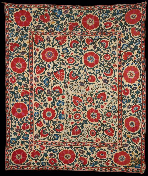 Curator: This cotton textile, “Wall Hanging,” by the Minneapolis Handicraft Project WPA from around the 20th century, immediately strikes me as a powerful example of pattern and repetition. What catches your eye? Editor: The repetition is definitely mesmerizing! It feels almost overwhelming with the geometric and organic shapes mixing together. I’m curious, what story might this textile tell us about its time and place? Curator: Precisely! Consider the context. The WPA, or Works Progress Administration, aimed to alleviate unemployment during the Great Depression. The Handicraft Project specifically empowered women, many of whom were from marginalized communities, providing them with employment and a creative outlet. Knowing this, how might we interpret these patterns? Editor: I guess I hadn’t really considered that! It seems like it moves it away from a purely aesthetic evaluation to one with political undertones, a form of expression? Curator: Exactly! These artisans were contributing to the national economy but also reclaiming their narratives, expressing resilience through art. The repeated motifs might symbolize community, shared labor, and the enduring strength of these women. Do you see any specific motifs that stand out in relation to these ideas? Editor: Maybe the floral square; the home or a garden could be an image for survival, or just the domestic made powerful? Curator: Nicely observed! It’s also important to think about how a repeated, traditionally feminine art like textile making gains renewed appreciation in a social context that otherwise undervalues it. The pattern-and-decoration movement that emerged later embraced this concept fully! I find it incredible how art intersects with social and historical currents. Has your perspective shifted regarding the textile? Editor: Definitely. It is so much more than just a pretty pattern. Curator: Indeed! This artwork reveals the power of textiles as carriers of history, labor, and resilience. Editor: This has really opened my eyes to the intersection of art, craft, and social history.