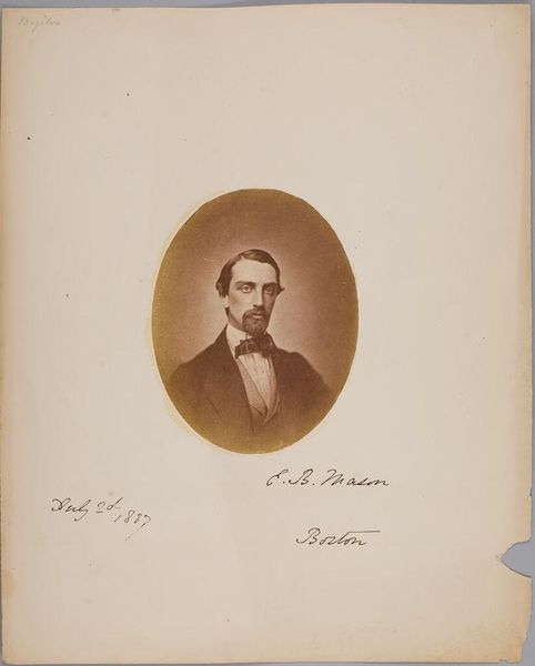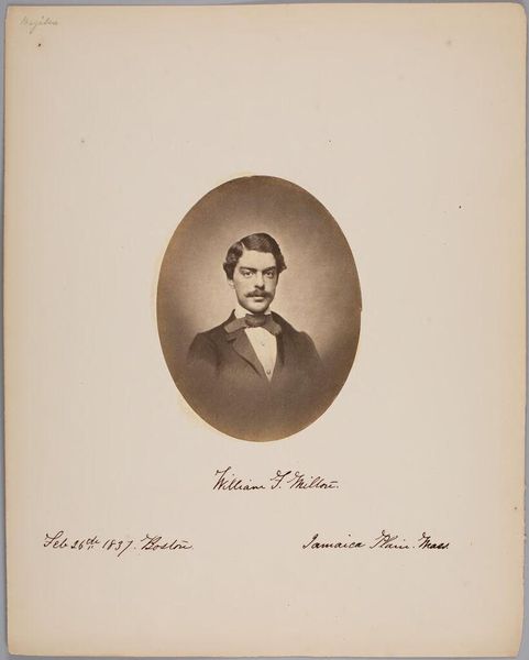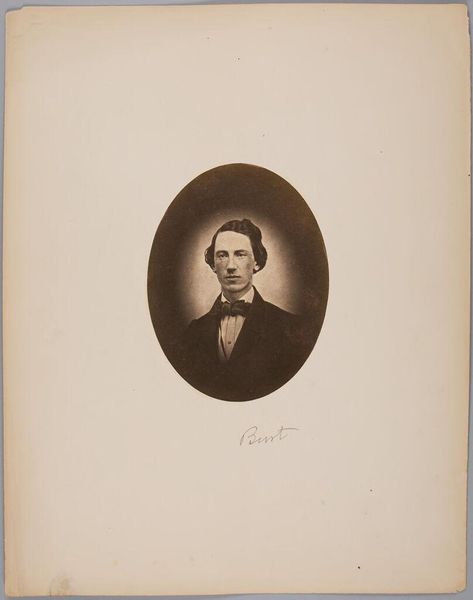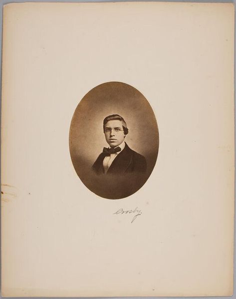 Curator: This is a portrait of William Henry Fitzhugh Lee, taken by John Adams Whipple. The image itself is quite small, only about 14 by 11 centimeters. Editor: It's striking, this intimate scale. The sepia tones lend a somber, almost ethereal quality. There's a stillness, a sense of contained presence. Curator: Portraits like these were powerful tools, weren't they? Connoting respectability, valor, and a connection to ancestry through symbolic presentation and pose. Editor: Absolutely, but also consider the chemistry at play. The collodion process, the light sensitivity, the artist's hand in developing the image – all these material factors contribute to the final product and its aura. Curator: The subject's gaze carries the weight of expectation, almost a burden of representing legacy. What lasting messages do you think such portraits conveyed? Editor: It speaks of class and permanence but reminds me too of the labor involved in image making – not just for the photographer, but also for the sitter. An intriguing tension. Curator: A fruitful duality, indeed. Editor: Yes, much to ponder.