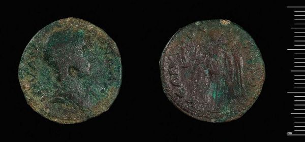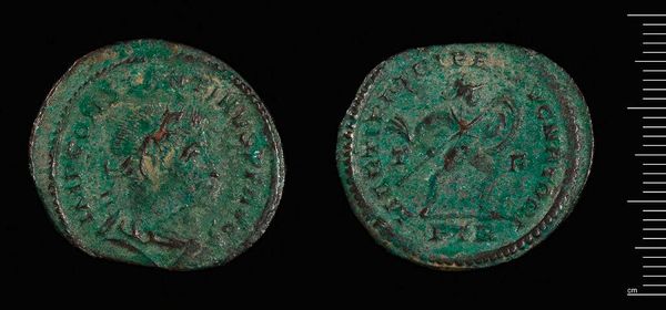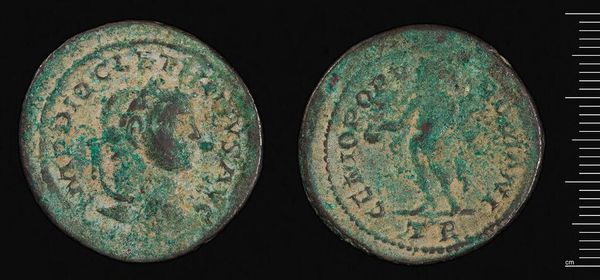 Editor: Here we have a Follis of Constantius I, from Carthage. What strikes me is the patina; its green hues almost obscure the figures. What do you see in this piece, from a formal perspective? Curator: The coin presents a fascinating interplay between form and decay. Observe the circular structure, bisected by two distinct portraits. The effigy of Constantius, though worn, retains a regal profile. Editor: And the figure on the reverse? Curator: Note the schematic rendering of the figure. Its posture, the distribution of weight, and its relation to the surrounding text, contribute to the symbolic language of power and authority. The coin’s material degradation invites a reflection on impermanence, challenging the very notion of lasting value it once represented. Editor: It’s interesting how the coin’s physical state adds another layer to its story. Thank you. Curator: Indeed. Considering its form and its decay, we gain insight into its historical and artistic significance.
