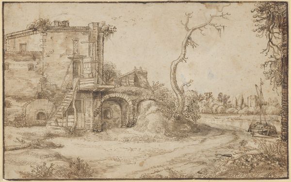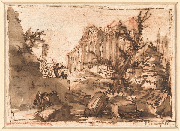 This landscape, rendered anonymously in ink, presents us with a rich panorama of ruins and pastoral life. Dominating the scene are the crumbling architectural remains, testaments to a bygone era. Observe the prominent archways and dilapidated walls, symbols of both human achievement and its inevitable decay. These architectural fragments echo similar motifs found throughout history, from Piranesi's etchings of Roman ruins to Romantic paintings that glorify nature reclaiming man's creations. The presence of ruins invites us to ponder the transience of human endeavor and the cyclical nature of history. This landscape, imbued with a sense of melancholy, engages our subconscious with themes of loss and the relentless march of time. The emotional power of such imagery lies in its ability to resonate deeply within us. It reminds us of our mortality and the impermanence of our works. The image prompts us to meditate on how cultural memory, embedded within visual symbols, can shape our understanding of the past and influence our emotional responses to the present.