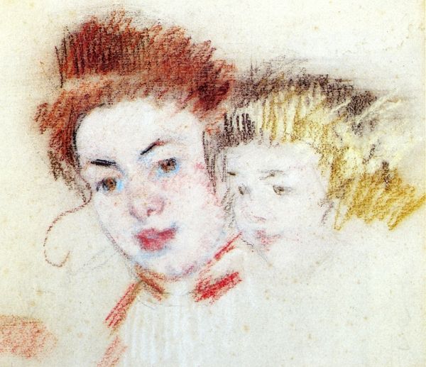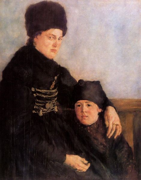 Curator: Here we have Mary Cassatt’s “Madame Meerson and Her Daughter,” a pastel created in 1899. Editor: The composition strikes me immediately – the dark tones are offset beautifully by the soft light on their faces. There’s a real tenderness in the arrangement, the way the daughter leans into her mother. Curator: Absolutely. Cassatt, of course, dedicated much of her career to depicting the private lives of women, particularly the bond between mothers and children, which at the time, really challenged the male gaze that dominated the art world. This wasn’t the dramatic heroism we often saw in history paintings, but something intimate and, frankly, just as vital. Editor: It’s interesting you mention “private,” because the poses are so direct, they're staring straight at the viewer. It is as if they're conscious of the act of being seen. Yet Cassatt’s masterful use of pastel softens what could be quite a stark image. Note the hatching, almost impressionistic, the way it breaks down form into shimmering planes of color. Curator: Right, the very texture speaks to that late 19th-century shift away from academic realism toward a more subjective visual experience. Also, the Meerson family were part of Cassatt’s social circle in Paris. They commissioned it, which places this work squarely within the cultural milieu of bourgeois patronage of the arts. Editor: That familial relationship translates. Cassatt avoids overly idealized portraiture, presenting these two figures with such raw directness. Observe how the artist renders depth simply with blocks of blended colors, eschewing clear linear contours to capture the immediacy of visual experience. Curator: And by embracing that informal composition, Cassatt’s reflecting larger cultural trends—a move toward informality in domestic life among the upper classes. Consider the societal role portraits like these played, establishing a kind of public, idealized image of the family. Editor: Ultimately, Cassatt succeeds at unifying the planes within the artwork, demonstrating the intimacy, comfort, and reliance a daughter and mother have between them, without being constrained to academic formal traditions. Curator: The painting’s strength lies, for me, in Cassatt's nuanced capturing of a changing society. Editor: Indeed, an impressive visual accomplishment worth experiencing.