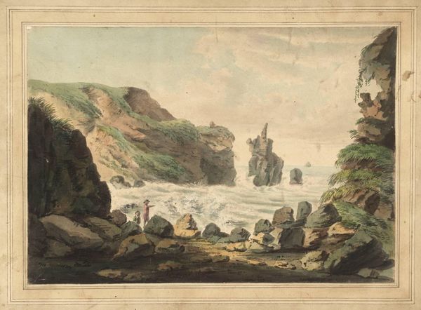 Curator: Here we have Frances Scott's "Dunskie Castle near Port Patrick," currently held at the Tate. It's a monochrome drawing, seemingly ink on paper, measuring about 31 by 50 centimeters. Editor: My initial impression is one of isolation, even melancholy. The stark tonal range emphasizes the castle's exposed position, almost besieged by the landscape itself. Curator: Scott, born in 1750, was working within a burgeoning market for picturesque views. This piece speaks to the romantic ideal of the ruin, but consider the socioeconomic implications of representing a decaying structure in that period. Editor: I see your point, but can't we also appreciate the formal qualities? The composition is carefully structured, using the diagonal thrust of the coastline to guide the eye towards the architectural focal point. The textures are remarkable, too, especially the rendering of the rocks. Curator: Absolutely, but it's important to remember that these images weren’t just aesthetic exercises; they were commodities, reflecting and shaping perceptions of land and ownership. Editor: Perhaps. Still, I find myself drawn to the artist's adept handling of light and shadow, giving a sense of palpable atmosphere to the work. Curator: A final thought: I wonder about Scott's intended audience. Was this intended for local consumption or for someone removed from the immediate context of the castle and its surrounding community? Editor: A worthwhile question, indeed. It certainly gives one much to ponder.