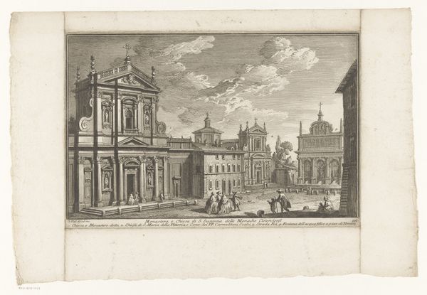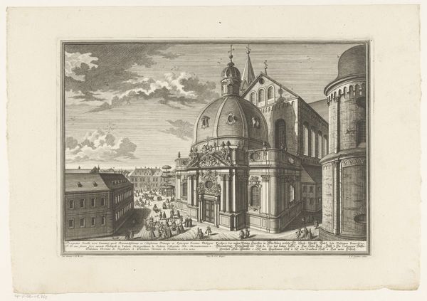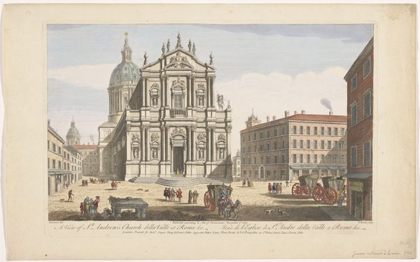 Editor: So, this print, "Gezicht op de San Luigi dei Francesi, te Rome," likely made between 1708 and 1756, shows a cityscape with this grand church. It's fascinating how detailed the etching and engraving are. What do you make of this particular depiction? Curator: Considering this cityscape through a materialist lens, it's vital to acknowledge the specific process and materials. The copper plate engraving—the labor involved in its production, and the intended consumer market—these things reveal a story about 18th-century society and economy. Do you think this was targeted at wealthy tourists? Editor: I think it likely was intended for tourists looking for a souvenir, due to the multiple languages included on the page. So you are saying the choice of printmaking itself says something about how the art was produced and meant to be consumed, not just the imagery? Curator: Exactly. This isn’t just a scene; it's an object created within a specific system. Look closely at the quality of line, the ink used, the paper stock. What can these material qualities tell us about the printmaker’s workshop and the potential accessibility of the image? The efficiency and relatively lower cost of printmaking made this imagery more democratic, though, in truth, even these could be exclusive depending on the finishing touches. Editor: It's also interesting to think about how many impressions they could make from a single plate. You also need to know about metalworking, paper making and distribution. And someone had to sit there, repeating these prints! Curator: Precisely! This print encourages us to move beyond a simple appreciation of the 'beauty' and inquire into the economic and social relations that brought this image into being, who controlled the production, and whose labor made it possible. The very nature of "Gezicht op de San Luigi dei Francesi, te Rome," existing as a multiple challenges notions around unique art objects. Editor: So it isn’t about the architecture depicted. It's about the entire process of creating and circulating images! It is an interesting way to consider art, viewing this as just another mass produced commodity. Curator: That's the core of it! Considering the societal structures in play when this art was made provides valuable insights that a purely aesthetic appraisal might miss.