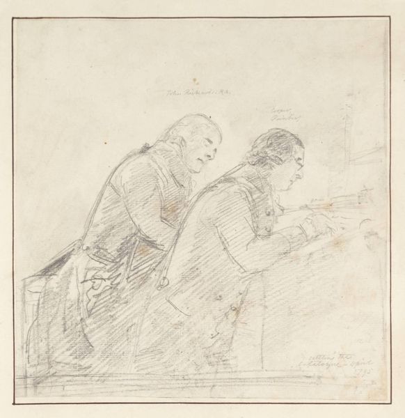 Curator: This is an 18th-century caricature entitled 'Sunday Walk' by an unknown artist from the British School, housed here at the Tate. Editor: Oh, it's hilarious! They look puffed up and terribly important, waddling along. Curator: Caricatures like this were popular social commentary, often poking fun at the wealthy. Their exaggerated features and clothing were designed to ridicule. Editor: I love how sketchy and loose it is. It feels like a quick jab, a fleeting impression captured on paper, you can almost feel the breeze on their faces. Curator: Precisely, the British School excelled at these witty observations of class and manners. It really reflects a society grappling with its own inequalities. Editor: Absolutely. You know, it’s so simple, yet it's so evocative. I find them oddly charming, even in their pomposity. Curator: Indeed, it's a testament to the artist's skill that even without a known name, the work continues to resonate. Editor: A little reminder that we all have our Sunday strolls, our little parades.