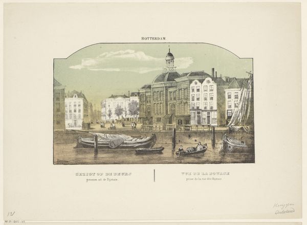 This print of Rotterdam’s old Hoofdpoort, was made by Frederik Lodewijk Huygens using lithography, a method of printing using a stone or metal plate with a smooth surface. Lithography is a planographic process, meaning that the image is neither raised nor incised. The image is drawn on the surface with a greasy substance, and then treated with acid to make the drawing adhere. Ink repelled by the non-drawn areas sticks to the drawing and is transferred to paper. This particular print is a chromolithograph, meaning that it employs multiple stones, one for each color, to produce a colored image. This method allowed for relatively quick reproduction, making images more accessible to a wider public. The soft, grainy texture unique to lithography gives the scene a somewhat hazy, dreamlike quality. The print process is key to understanding the image, its availability, and its status as both a work of art and a document of a time and place.