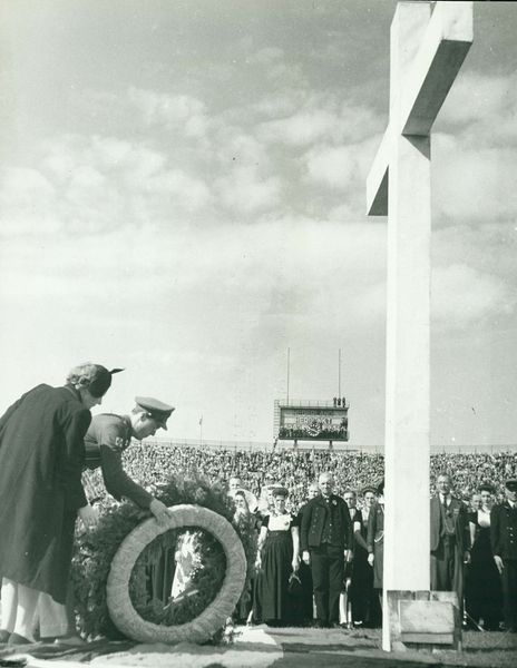 Cas Oorthuys made this photograph of the first national liberation celebration in the Olympic Stadium. It shows a large map of the Netherlands outlined on the stadium field with people standing along the borders. The image captures a moment of collective identity formation in the wake of World War II. The people standing on the outline of the map can be seen as literally embodying the nation. This physical occupation of space emphasizes the importance of territory and belonging in the postwar reconstruction of Dutch national identity. In the context of postwar Europe, we can understand this event as part of a broader effort to rebuild social cohesion through carefully staged public events. By studying archival materials like newspapers, government documents, and personal accounts, we can gain a deeper appreciation of the complex social dynamics that shaped this historical moment. Art, in this sense, reflects both the real and the ideal of Dutch society at this pivotal moment in its history.