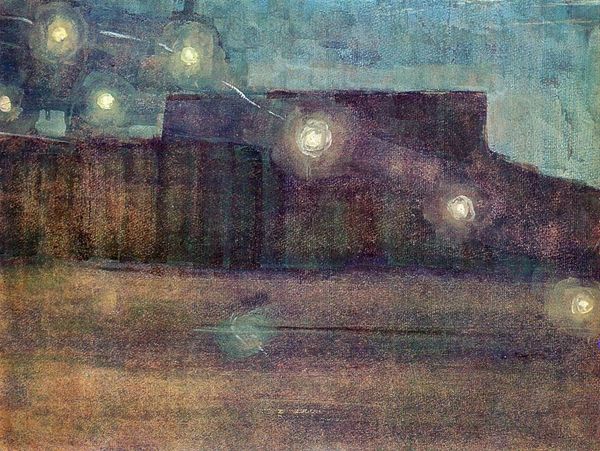 Editor: Here we have Mikalojus Konstantinas Ciurlionis's oil painting, "The Past," created in 1907. What immediately strikes me is the almost brutalist architecture of the central form, contrasted against that radiating light. What do you make of the formal elements at play here? Curator: The imposing architectural structure dominates, certainly. Notice how the artist uses geometric forms: the rectangular mass of the structure against the fan-like rays of light. Consider how these shapes create a sense of tension, the rigidity versus the ethereal. The subdued palette reinforces this; the earth tones of the structure stand in stark contrast to the luminous glow. Editor: I see what you mean. It’s like a very solid object interacting with something entirely intangible. The texture looks almost rough. What purpose could that textural choice have? Curator: Exactly! Consider the texture. It isn’t smooth or refined. The brushstrokes are visible, lending a sense of rawness, a connection to the earth, and time. This surface contrasts profoundly with the emanating light. Ask yourself, what feelings does this juxtaposition evoke? Is it comforting, unnerving, perhaps both? Editor: Definitely both. I feel this strange combination of solidity and the ephemeral. Like the ruins of a long-lost, gigantic something. Curator: Indeed. It might be useful to think about that ‘gigantic something’ in relationship to the painting’s very title: “The Past.” The rough materiality emphasizes the age and physical decay but light also promises potential. Consider how these aspects shape the composition as a whole. Editor: This focus on texture and form is highlighting aspects of the painting I hadn't considered at first. It's not just a landscape, it's an experience in materiality and structure! Curator: Precisely! Analyzing these elements helps us unravel the artist’s intended message and the very essence of this potent work.