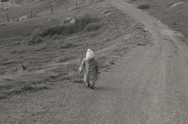 Curator: This is a compelling black and white photograph called "Roads and Trees" by Abbas Kiarostami. What's your immediate response to it? Editor: Isolation. It evokes this profound sense of solitude and perhaps even a hint of desolation, like looking at a memory fading at the edges. It really pulls at you, doesn't it? Curator: It certainly does. Looking closer, you see this incredible composition. The road acts as a stark, leading line directly towards two human figures silhouetted against a sky pregnant with heavy clouds. The monochrome palette reduces everything to its essence. Editor: Absolutely, the reduction to stark monochrome accentuates the structural form of the landscape, while creating this wonderful textural contrast. The rugged terrain is rendered so tangibly, that it heightens the almost abstract simplicity of the two figures above it. They really are just shapes in comparison to the landscape itself. Curator: Exactly! And think about that path—rutted, worn, a testament to journeys taken. It is winding—almost mirroring life’s own often-meandering route—and it guides us not just through the visual landscape, but perhaps into our own internal landscapes. It's quite affecting to wonder what’s driving the figures and what drives each of us? Editor: So true, it pulls at something deeper than a visual experience; it is as though it has captured some of humanity’s common hopes and experiences. And those figures atop that path, barely present in the frame, become representations of people pressing forward. Very simple but undeniably poignant. Curator: Kiarostami has that unique way of distilling big ideas into deceptively simple visual moments. I find myself returning to this piece time and again, each time seeing something different in the arrangement of shades, lines and form, as if there is no resolution to what is being depicted in our minds. Editor: I completely agree. It remains open, prompting further questions about identity, nature, and meaning and makes it difficult to look away.