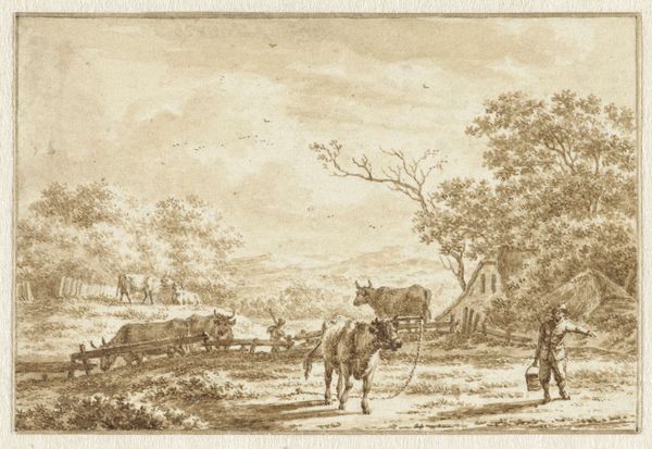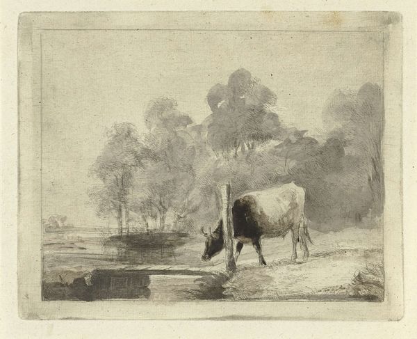 Antonie Franciscus Dona created this etching of a cow in a landscape sometime in the mid-19th century. The image presents a serene view of the Dutch countryside, a popular subject during the Romantic era. In the Netherlands, landscape art served as a form of national expression. It reflected a deep connection to the land and the rural way of life. Artists like Dona often depicted cows, windmills, and waterways, symbolizing the country’s agricultural wealth and its ongoing battle against the sea. This etching, with its careful attention to light and shadow, elevates a simple scene into an emblem of national identity. To fully understand such works, we might examine agricultural policies, land reclamation projects, and the broader cultural values that shaped Dutch society at this time. Only then can we appreciate the complex layers of meaning embedded in this seemingly straightforward image.