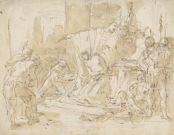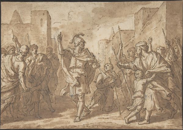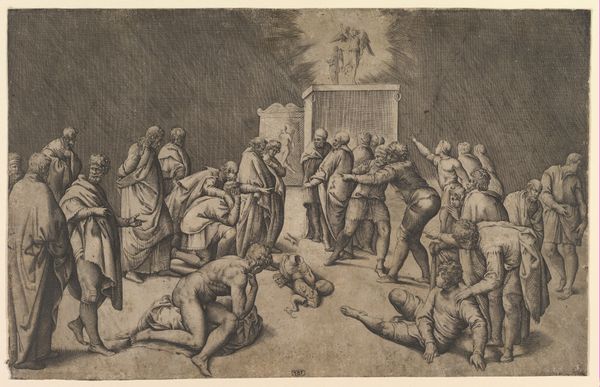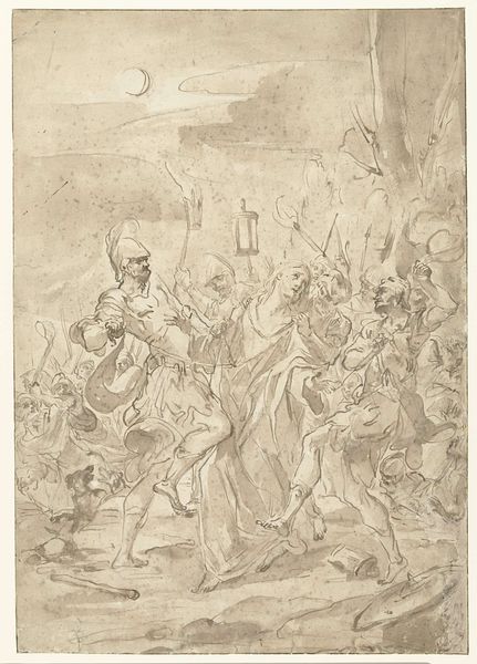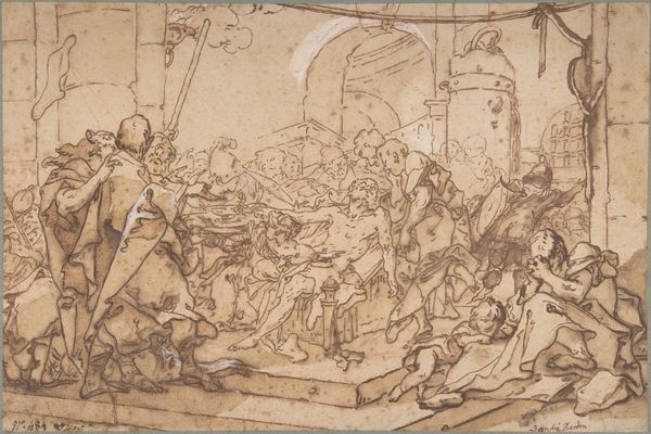 Curator: This drawing, "Christ Falling Under the Cross," is attributed to Caspar Fraisinger and captures a pivotal moment from the Passion. The work on paper uses ink, chalk and charcoal. It’s currently held in the collection of The Art Institute of Chicago. What is your initial reaction to this composition? Editor: Visually, I'm struck by the dynamic yet oppressive atmosphere. The swirling lines, the chaotic layering of figures...it speaks to suffering and brutality, a claustrophobic nightmare rendered in monochrome. Curator: Indeed. Fraisinger employs stark contrasts to emphasize the drama. Notice how Christ, collapsed under the weight, is placed centrally but surrounded by figures rendered in great detail; the lines convey tension, directing our eye across the tableau of Roman soldiers and the gathering crowd. Editor: And that crowd suggests something important, the wider societal and political structures complicit in this moment. Each character, however quickly sketched, represents a viewpoint, from the active oppressors to the silent observers. One cannot separate this drawing from the history of religious persecution. How has its reception evolved over time? Curator: I understand that its power and directness transcends the purely religious, engaging more universally with themes of injustice, struggle, and, ultimately, martyrdom. We observe certain patterns: linear precision is selectively introduced and seemingly abandoned; a controlled technique implies a narrative slipping out of control. Editor: Yes, the lack of rigid perfection in style seems critical here. Consider, the blurring and layering become visual metaphors for the erosion of justice and the blurring of individual moral responsibility within collective violence. Curator: Moreover, the architectural background should be considered within the visual weight this composition manifests. See how it towers behind Christ? Editor: Exactly, that subtle depth that encloses and smothers what little agency Christ and his allies possess in that key moment. By drawing our attention into those finer strokes of perspective Fraisinger exposes his historical era within it too, to the building of religious institutions on violence. Curator: Precisely. His choice of such a raw medium underlines this feeling, the lack of varnish to provide historical transparency here for modern eyes. Thank you for sharing your observations with me. Editor: Likewise. This was a stark reminder of how formal elements can amplify an artwork’s resonance across the ages.