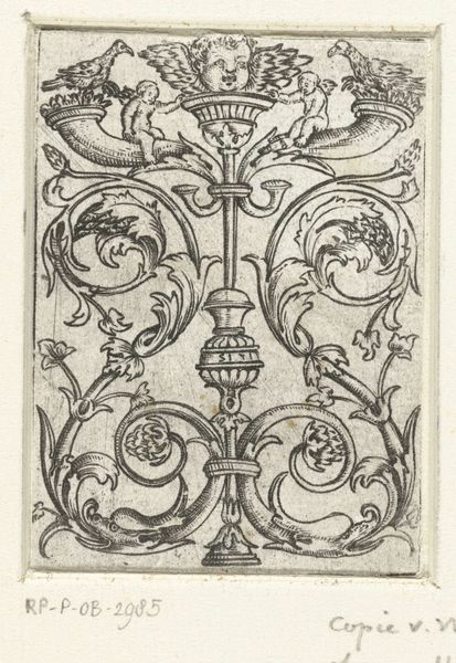 Curator: Heinrich Aldegrever's "Vlakdecoratie met bladranken en grotesken," made in 1552, immediately strikes me with its overwhelming sense of density and careful detail. Editor: The initial impression I get is one of opulence teetering on the edge of unsettling. It feels deeply entrenched in its era, hinting at the power dynamics inherent in such ornate displays. Curator: Exactly! It's an etching and engraving, showcasing an incredibly skilled hand at manipulating the metal plate. Note the level of detail he achieves. We’re really looking at techniques of labor and reproduction here. Think about the processes and work of reproducing this design on a printing press to create multiple copies. Editor: And those reproductions had purpose. Decoration, yes, but consider the grotesque figures intertwined with those leafy vines. Grotesques historically functioned to ward off evil, but here, they also perform power—displaying the commissioner's elevated taste, knowledge of classical forms, and, therefore, control. What is the historical context of accessing, owning, commissioning an artwork such as this? Curator: The materials and processes give a specific character to the finished image. We have to understand it within a culture of printmaking, distribution, and use. Aldegrever's ability to generate such precision allowed him to create a widely appealing aesthetic product that spoke to current tastes and the economics of the time. Editor: These objects often reinforced social hierarchies through display. Note the androgynous features of the sphinxes in the lower part of the design. How does playing with gender norms in these fantastical creatures fit within the broader Renaissance ideas regarding beauty and power? What messages does this convey regarding beauty and the expectations of an elite class? Curator: Good question! From a purely material perspective, Aldegrever had to be incredibly meticulous. Etching demands precision, control, and a deep understanding of how acid affects metal. But I like how you pushed us beyond simply technical to thinking of that in relation to power! Editor: Thanks! Ultimately, art is never created in a vacuum; considering both the process and its original socio-political function enrich the understanding. Curator: Agreed. Combining knowledge of both is the only way we can properly interpret the material culture and meanings of the past!