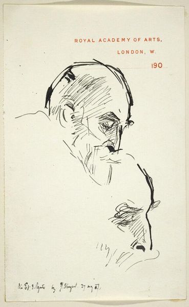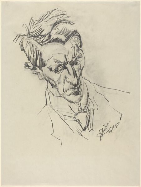 Curator: This is Egon Schiele’s "Dr. Ernst Wagner," a 1918 ink and pen drawing. Editor: The spartan, raw quality immediately strikes me. It's rendered with minimal, almost frantic lines; you feel like you are observing a study or perhaps an image produced under great stress or duress. Curator: Absolutely. Consider Schiele’s expressionistic approach; the elongated face, the wiry quality of the ink lines, and the somewhat detached gaze. The sitter's face seems to embody some kind of tormented inner state, almost archetypal, yet specific. Editor: But how much is down to specific materials? He's using very rudimentary materials – pen and ink, paper. It democratises image-making; so inexpensive that practically anyone could access the basic methods on display. There is also this implied question about the economics and patronage necessary even to produce works so radically simple as this one. Curator: Precisely, we shouldn't neglect to notice Schiele’s employment of certain universal visual markers and associated expectations of formal portraiture while using commonplace material supports to create the likeness. This is meant to convey much more than literal appearances. Those hands especially are knotted and evocative – clasped as they are, they seem burdened, maybe carrying a world of unspoken anxieties. Editor: Right, those gnarled hands speak volumes about labor, class, perhaps even about an internalized kind of toil and consumption which eats away at both mind and body. Given the date of 1918, and Schiele's death soon after, one has to reflect upon conditions and resources. Curator: Ultimately, Schiele’s graphic language reflects more than surface-level detail; instead, the visual construction serves as an exploration of deep psychological experience. I keep asking myself: how can an economical depiction resonate so potently? Editor: And I’m asking what constraints – both social and material – produced this particular distillation, this apparent urge for expressive image-making despite circumstances seemingly at odds with artistic pursuits? A true document, materially grounded and ripe with encoded symbolic weight.