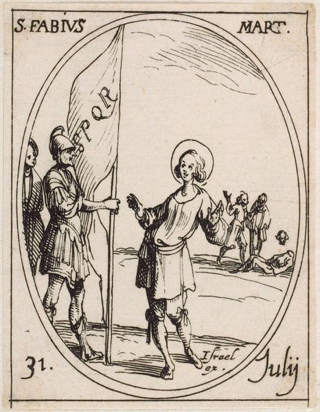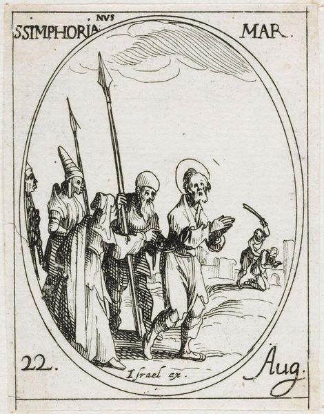 Editor: This is Jacques Callot's "Saints Chrisantus and Daria," a small etching. It depicts a rather violent scene, but the saints appear serene. What symbols stand out to you? Curator: Note the stones being cast, a clear reference to martyrdom, a powerful symbol of faith under duress. Consider how the halo, a visual signifier of sanctity, contrasts with the brutality of the act. Editor: So, the halo is not just decorative? Curator: Precisely. It’s a visual cue linking them to a legacy of unwavering belief despite persecution. These symbols carry centuries of emotional and cultural meaning. Editor: I see how Callot uses symbols to communicate a bigger idea. Curator: Indeed. By understanding their symbolic weight, we can see how art serves as a cultural memory, connecting us to the past.