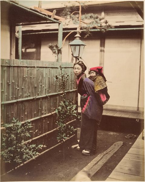 Curator: Here we have an albumen print dating from the 1870s, "[Japanese Woman in Traditional Dress]", credited to Suzuki Shin'ichi. It’s currently held at the Metropolitan Museum of Art. The sepia tones give it such an antique feel. Editor: It certainly does. I'm immediately drawn to the deliberate staging and how that impacts my perception. It feels both intimate and constructed simultaneously. Curator: Indeed. The materials themselves, the collodion process layered on paper, speaks to the burgeoning market for exotic imagery at the time. The photographic print as a commodity traded across cultures, you see? Editor: And those cultural exchanges! Consider how the details become imbued with meaning. For instance, the bamboo fence, the lantern—elements that represent Japan in the Western imagination, and the woman, her costume and expression serving as vessels for projecting orientalist fantasies. Curator: Precisely! And think of the labor involved in setting up the scene, preparing the chemicals, and the subject who, despite our assumptions of passivity, surely brought her own experiences into this encounter with modernity. The print becomes a tangible object of that exchange, reflecting both the process and the cultural context. Editor: It is fascinating how photography immortalizes specific symbols – the kimono pattern, her hairstyle, even the angle of her head. These things carry coded information and perpetuate, but also solidify, the image of an era for subsequent viewers. Curator: It makes you wonder about the photographer's intent too, not just as an artist but also as a craftsman making a living in a rapidly globalizing world. The chemistry and physical process are embedded into what you consider the cultural meaning, which can then have very physical implications as trade and representation shift based on images like this. Editor: A powerful blend of the staged and the serendipitous, really. Curator: Ultimately, the image pushes us to investigate not only what we see but how this photo as a material object was created and consumed within its time. Editor: Yes, understanding its symbolism within our evolving framework will allow viewers to reinterpret, critique, and engage with a much deeper appreciation.