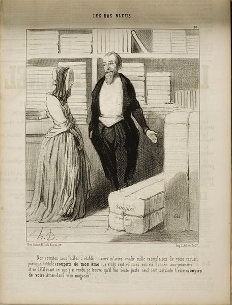 Curator: This is "Nos comptes sont faciles à établir…" by Honoré Daumier, a lithograph offering a glimpse into 19th-century French society. The scene depicts a bookseller interacting with a female customer. Editor: Immediately, I'm struck by the imbalance – the towering stacks of books versus the two figures, suggesting an intellectual power dynamic at play. The mood feels satirical, perhaps critical. Curator: Absolutely. Daumier often critiqued social norms through his art. The title, which translates to "Our accounts are easy to establish," coupled with the text below, suggests a commentary on the commodification of art and intellectualism, particularly concerning women writers. Editor: The books themselves seem to symbolize knowledge and creativity. The woman, possibly a writer, seeks validation or recognition. Her dress with the head covering suggests an attempt to fit in, a societal mold. Curator: Indeed, and Daumier’s choice of lithography allows for nuanced shading and detail, highlighting the figures' expressions and the cluttered environment. It reflects the rapidly changing landscape of publishing at the time. Editor: It makes me wonder about the role of women in the arts back then, and the struggle for equality they faced. A struggle that unfortunately still resonates today. Curator: Exactly. It invites us to question the historical and ongoing power dynamics within creative fields. Editor: And to perhaps ponder how we value art beyond mere numbers or transactions.