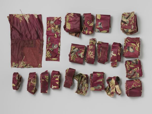 Curator: Welcome. Here we have what's known as the "Zegeltas Johan de Witt," a seal bag crafted sometime between 1600 and 1700, its maker, unfortunately, lost to history. Editor: The first thing that strikes me is the deep burgundy color. It’s very rich, almost regal. The velvety texture also adds to the sense of opulence. Curator: Indeed. As a textile piece from this period, consider how this material was sourced, dyed, and woven. Who were the laborers? Was this locally produced or part of a larger trade network? Such a luxurious item signifies social status. Editor: I see what you mean. But formally speaking, observe how the square shape and vertical lines create a sense of balance. Even the tassels on the cords contribute to a satisfying symmetry. There's a simplicity, despite the richness of the fabric, that's very effective. Curator: Think about the bag’s function. Seals were crucial for authenticating documents, making this bag an object connected to law, trade, and power. This shifts our interpretation from mere aesthetics to questions of utility and agency. Editor: I’m struck by how time has altered the surface, with noticeable wear and fading that tells its own tale. The piece appears delicate, yet you sense its robustness, capable of securing and transporting items of consequence. Curator: Precisely! Understanding its creation, application, and journey reveals layers of significance beyond its physical appeal. Editor: Looking closely at its texture and form gives you an idea of a different age. But with some new insight of production behind this Baroque piece, one may come away from it understanding more about an interesting time in history.