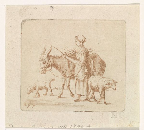 This print of a man standing behind a horse presents a tableau of labor and companionship. The horse, laden and weary, stands as a powerful symbol of burden, its presence echoing ancient motifs of servitude and toil. The figure behind it, perhaps a driver or caretaker, suggests a symbiotic relationship, one of mutual dependence. The depiction of the horse here is reminiscent of ancient agricultural scenes, where animals were central to human survival and progress. We see echoes of this motif in various cultures, from Roman frescoes to medieval tapestries. The image engages on a deep, subconscious level through the emotional weight of the horse's posture. The visual language of fatigue and submission is not just a representation of the animal's physical state, but also evokes the shared burdens of human existence, speaking to our collective memory of struggle and perseverance. The cyclical return of this symbolism reminds us that though civilizations rise and fall, the primal connection between humans and animals endures, continually resurfacing in art, each time imbued with new cultural significance.