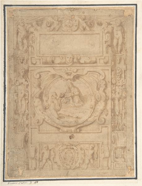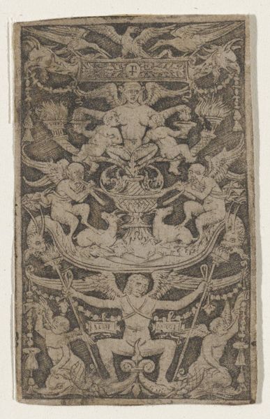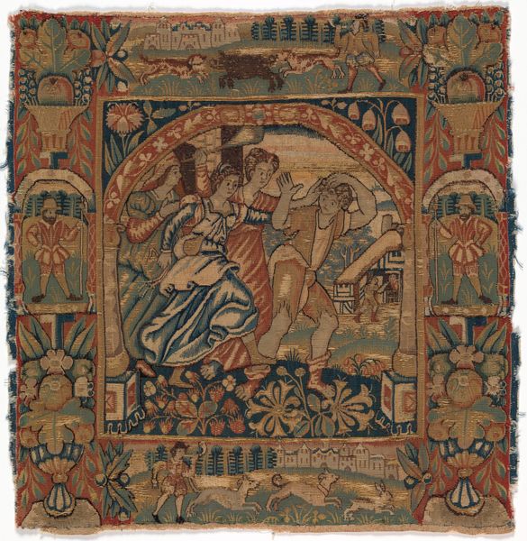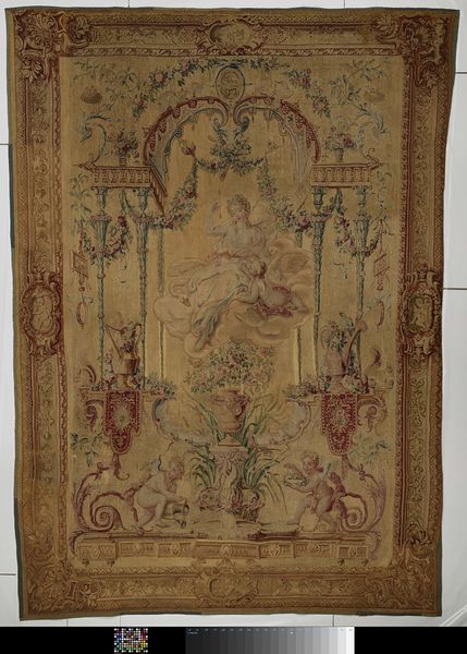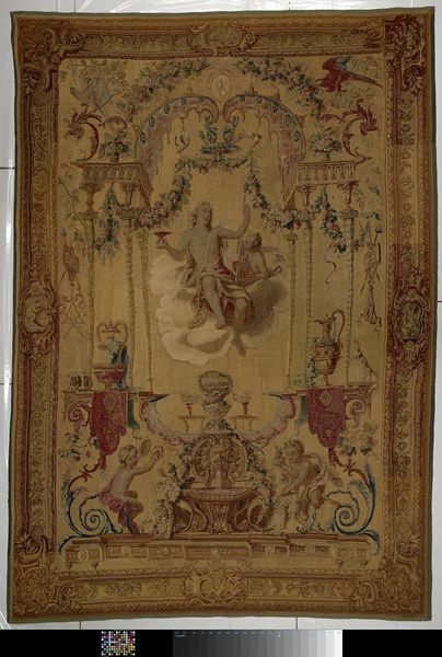 Editor: Here we have "Neptune from the 'Doria Grotesques'," a textile crafted between 1545 and 1555 by Perino del Vaga. It’s currently housed at The Met. It’s a gorgeous, densely packed image! What strikes me most is the way the central figure of Neptune seems both powerful and somewhat contained by the decorative elements surrounding him. What do you see in this piece? Curator: What I see is a complex interplay of power, representation, and historical context. The tapestry format itself signifies luxury and elite status. Consider the figure of Neptune: in del Vaga's time, this wasn't just a benign mythological figure; he embodies male dominance, control over the seas, and by extension, global trade routes. Editor: That makes me think about colonization… Curator: Exactly! These seemingly ornamental decorations subtly reinforce existing power structures. The inclusion of grotesques, figures that blend human and animal forms, was popular during the Renaissance, but here, aren't they also subtly "othering" in contrast to the idealized, central figure of Neptune? It encourages us to ask questions about who is centered, who is marginalized, and how these depictions served to legitimize a particular worldview. Editor: I didn't think about the power dynamics at play. I was more focused on the aesthetic appeal! Curator: It's easy to get lost in the beauty, but critically engaging with art requires us to dig beneath the surface. Who commissioned this piece, and for what purpose? These tapestries were not just decorative; they were carefully curated displays of power and wealth meant to send very specific messages. Editor: This tapestry does speak volumes when viewed through that lens! Now I can see it embodies something much deeper than first impressions let on. Curator: Precisely! It encourages a conversation far beyond the visual plane, delving into the cultural and political landscapes of its time, and ultimately, their echoes today.