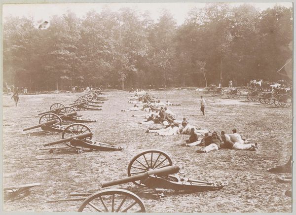 Editor: This is a photograph from 1864 by Andrew Joseph Russell titled "Entrenchments on Left of Bermuda Hundred Lines, Near Richmond, Virginia." The gelatin-silver print depicts a war scene, and the landscape feels desolate, despite the rows of trees in the distance. What do you see in this piece that might be less obvious at first glance? Curator: I notice how the wooden barricade with the sandbags resembles a visual language borrowed from earlier fortifications, now adapted to photography during wartime. Sandbags as anonymous guardians remind us of the human cost and the psychological weight of holding a defensive line. Consider how these repeating shapes represent endurance and anxiety. Editor: Endurance and anxiety... it's interesting to think of those burdens symbolized by the sandbags, almost like stand-ins for people. Is that a common reading of these types of images? Curator: Symbolism in wartime photography can be multifold, consciously presented, unconsciously embedded, and culturally understood in a shared experience. Notice how the photograph lacks grand heroic gestures, focusing instead on a mundane aspect of military operations; how does it shift the symbolic register of war? Editor: It definitely feels more grounded, less glorified than what I might expect. It focuses on what's real. That line of trees in the back then--is that also meant to symbolize something? Curator: Think of the tree line as a border, or limit: beyond safety and known space, or a future. A line where life continues unaware while on the front, there is fear and possible death. Perhaps the trees are symbolic of life continuing in the distance even during war? Editor: So the picture contains multiple layers that reflect a society at war, like hope and struggle together. Thank you for helping me to see this photograph beyond its initial stark realism. Curator: Indeed, this image presents the psychological and cultural landscape of war.
