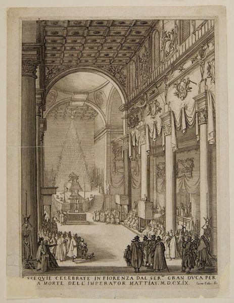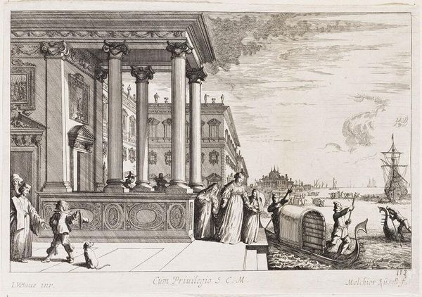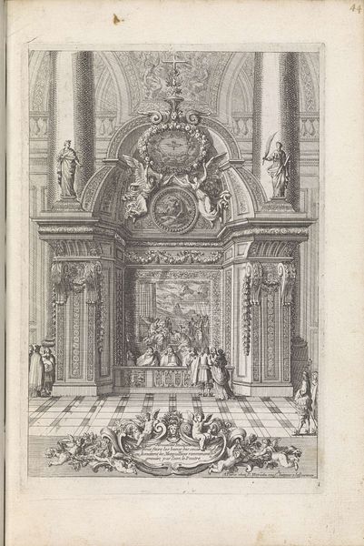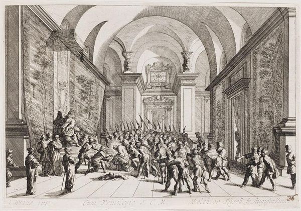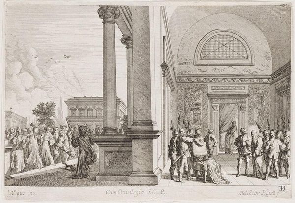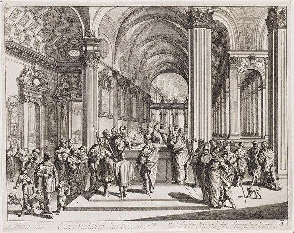 Curator: Melchior Küsel's print, "Last Supper and Washing of Christ's Feet," presents two biblical scenes within an elaborate interior setting. The dimensions of the sheet are 14.7 by 20.4 centimeters. Editor: Immediately, the weight and detail of the architecture command attention, dwarfing the figures and suggesting a grand stage for these acts of humility and betrayal. Curator: The architecture, with its imposing columns and sculpted figures, speaks to the power structures inherent in religious institutions of the time. The printmaking process itself involved skilled labor and a distribution network reflecting a complex social context. Editor: Absolutely. The visual contrast between the rigid, formal setting and the intimate, emotional narratives of the Last Supper and foot-washing creates a powerful tension. One cannot miss the subtle symbolism of piety. Curator: The etching process allowed for the relatively mass production of this image; hence it could be distributed widely. The materials involved, the copperplate and the ink, speak to the accessibility of religious imagery. Editor: These carefully chosen and placed symbols and scenes offered viewers a way to meditate on faith and human connection within a divine framework. It almost asks us to consider whether we can see them now in the same way. Curator: Indeed, the accessibility allowed for personal interpretation. Editor: A compelling piece, really.