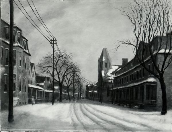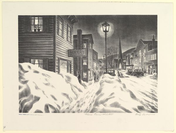 Curator: Marion Post Wolcott's photograph, "Center of Town after Blizzard, at Nite, Woodstock, Vt.," captures a quiet, snow-laden scene. Editor: The tonal range is remarkable, from the brilliant streetlamp to the velvety shadows—it creates a palpable sense of stillness. Curator: Wolcott, working for the Farm Security Administration, often documented rural American life. This image, although undated, speaks to the realities and resilience of communities during challenging times. Editor: The composition uses the snowdrifts in the foreground to draw the eye toward the illuminated street. It’s a clever use of form to emphasize the town's center. Curator: Absolutely. The image highlights the communal experience of weathering a storm, showcasing a moment of quietude amidst potential hardship. Editor: Indeed. The stark beauty and balanced composition create a visually arresting image, transforming a simple street scene into something iconic.