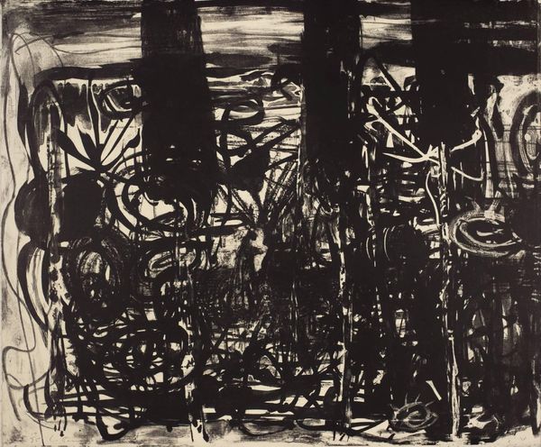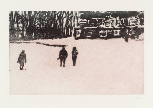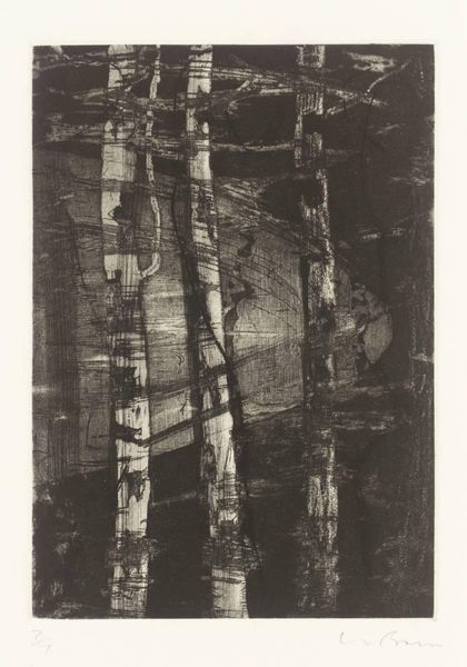 Curator: This is Peter Doig's "Concrete Cabin," held here at the Tate. It’s an aquatint etching. Editor: It's so dense! The interplay of black and white creates this claustrophobic, almost unsettling feeling. Curator: The print uses layering, which helps to abstract the architectural form. Its scale encourages an intimate viewing experience. Doig's cabin acts as a modern intervention within its natural setting. Editor: Certainly. The printmaking medium itself lends to the piece's historical weight, referencing techniques used for centuries to disseminate images and influence public opinion. Curator: Precisely. The high contrast pushes the boundaries of legibility, compelling the viewer to actively engage with the composition to decode it. Editor: It’s a great reminder of how artists can make us reconsider familiar structures and their places within a shifting landscape. Curator: Indeed. Doig provides us with a compelling examination of form and perception.