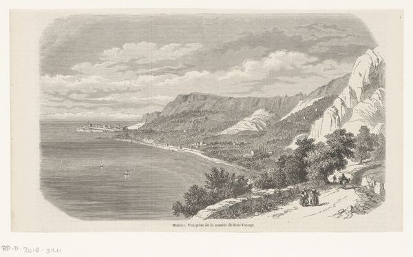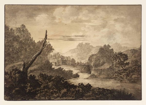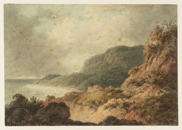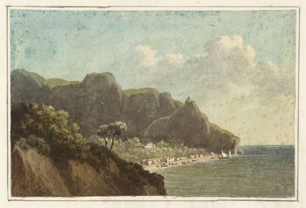 Curator: Edward Dayes created this watercolor, "View of Hastings from the East," now held in the Tate Collections. It captures a specific coastal scene, likely around the late 18th century. Editor: It's striking how muted the palette is, almost monochromatic. It gives a kind of… melancholy grandeur to the scene. Are those ships off the coast? Curator: Indeed. They represent a vital maritime element, suggesting trade and perhaps military presence. Notice how the cliffs loom, acting as a symbol of British strength and natural barriers. Editor: Right, and that soft light almost feels like nostalgia. The way the artist handles the texture of the cliffs, it’s like they're crumbling a bit, like history itself is eroding. Curator: That's a keen observation. Watercolors often conveyed a sense of immediacy and topographical accuracy, but here Dayes perhaps hints at the transient nature of power and place. Editor: I feel almost like I'm there, standing on the shore, watching a scene unfold that echoes both a specific moment and something timeless. Curator: The image certainly invites us to consider the enduring relationship between humanity and the sea. Editor: Absolutely, and the way Dayes used light... it's like he's painting memory itself.