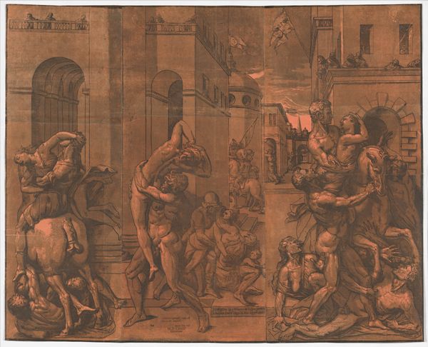 Curator: Examining Bartolomeo di Tommaso's "The Betrayal of Christ," executed in tempera sometime between 1440 and 1450, presently held at the Metropolitan Museum of Art in New York. My initial response is quite stark. There's a pronounced dynamism countered by an odd stillness. Editor: That tension, I think, stems from the painting's attempt to grapple with a theological subject during the early stages of the Renaissance’s evolving artistic and material practices. The medium, tempera, dictates a certain rapid execution that must consider pigment choices related to location and access of specific goods within 15th century Umbria. Curator: Precisely. Note the use of color – a high-keyed palette rendering spatial recession somewhat ambiguous, flattened, in favor of symbolic presentation. The chromatic intensity underscores emotional discord. Forms and figuration are abstracted almost, less about accurate proportion and more about narrative urgency. Look closely at the composition of figures; the crowding evokes claustrophobia, accentuating the betrayal's personal and cosmic impact. The almost decorative gold details in certain figures mark a divergence in social status that is materially embedded. Editor: Agreed, but the labor must also be factored in. Beyond gold application and symbolic gesture, consider the physical application of tempera, built upon artisanal traditions and guilds – this image of betrayal becomes the very product of cooperation, reflecting material circumstances influencing both style and output, so deeply affected by its reliance on social systems. The location is also significant in a non-obvious way; for whom and where was the image created for. Curator: A pertinent point, one regarding audience, function, context, and, more generally, reception. Thinking now of the intentional fracturing of the piece into episodes, one that seeks to distill complexity into an easily digestible moment. But the use of bold color strikes me foremost as a key structuring device, working toward formal harmony out of what appears at first a chaos. Editor: This "chaos", might be an attempt to engage its contemporary audience through the employment of familiar materiality. Such devotional images facilitated spiritual experiences using very real worldly, material goods. The true magic resides, of course, in their transmutation. Curator: I would simply suggest the alchemy rests in the pictorial logic as well, less tied directly to the circumstances of material. Editor: A debate as old as the work itself, wouldn't you agree? Curator: Indeed. And one it elegantly transcends.