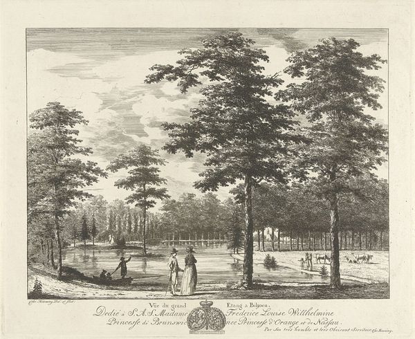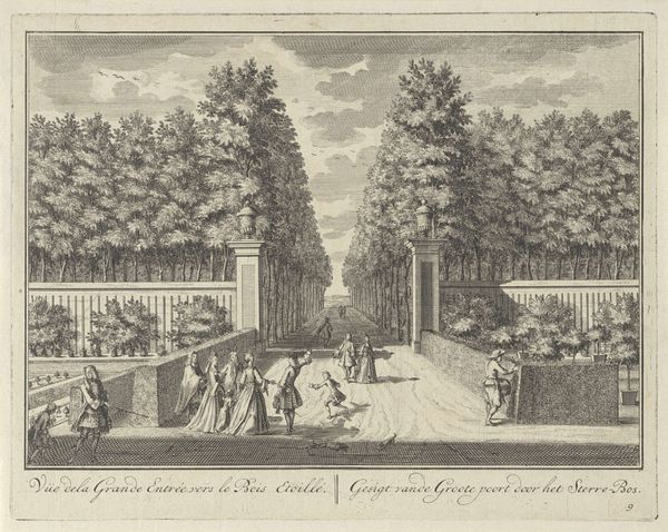 Editor: Here we have an engraving, titled "La Salle aux Marronniers" by Jean-Baptiste Rigaud. It gives us this elaborate scene in what looks like a formal garden. What really strikes me is how meticulously the garden and figures are laid out. What do you see in this piece? Curator: Oh, it whisks me right back to powdered wigs and perfumed handkerchiefs! What I find particularly delightful is how Rigaud captures a moment of orchestrated leisure. It’s not just a garden, is it? It’s a stage. Editor: A stage, yes, with everyone dressed to the nines. It almost feels like we're peeking into a theatrical performance. Curator: Precisely! These weren't candid snaps. Each individual is acutely aware of being *seen*. Tell me, what does that awareness suggest about the society Rigaud depicts? Editor: That display and social status were really important? This is a very stylized portrayal. There's this almost playful manipulation of nature— the symmetry, the carefully placed statues... it's all very constructed. Curator: It is, and the genius of Rigaud is revealing the very artificiality they’re all so carefully enacting. Consider that level of detail, this meticulous creation… What did this garden mean for its inhabitants? For Versailles? It must be something incredibly personal and shared. Editor: I never thought about it that way, like he's winking at the audience. Looking closer, I see the print's trying to tell us something about power and performance. Curator: You’ve touched upon a rather subtle tension between surface and depth in baroque aesthetics, an insight that I truly hope I shall hold dear. It is almost as we ourselves just became a painting.