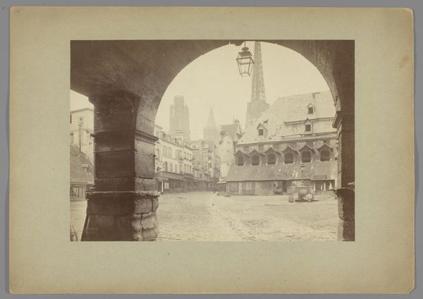 Curator: Albert Greiner’s “De Kattenburgerbrug, 1879,” a gelatin-silver print, captures a cityscape frozen in time. What are your initial impressions? Editor: The tonality is what strikes me first—a sort of sepia dreaminess. It gives the scene a somber yet stately feel, despite what seems to be a celebration occurring. The crisp lines of the bridge’s architecture, balanced by the soft focus in the background, create an intriguing contrast. Curator: Indeed. The photograph is documenting more than just a bridge; it captures a moment of public celebration or perhaps a commemoration. The banners and crowds point to a collective event rooted in a particular moment in Dutch history, ripe for socio-political interpretations. Editor: Focusing on its composition, observe how the bridge bisects the frame, almost dividing our attention. This division enhances the image’s structural tension, pushing the viewer to analyze the relations between the architectural elements and the soft human figures, emphasizing its function as a space of transit and connection. Curator: Yes, the bridge literally and metaphorically connects disparate entities, and it serves as an interesting platform to explore ideas of inclusion and exclusion at the time. Who had access, who was represented? Were certain bodies favored? The work might offer avenues for discussing class structures and public life in 19th-century Amsterdam. Editor: From a purely formal standpoint, consider how Greiner employs light and shadow. The way light graces the bridge's stone juxtaposed against the building emphasizes the materiality. This interplay guides our eye through the scene, structuring a path of viewing within the artwork. Curator: And yet, that same interplay of light and shadow casts the figures in an ambiguous haze, perhaps hinting at the often obscured or overlooked contributions of working-class individuals in these kinds of national celebrations. Editor: It's a very balanced composition, one can appreciate the way the formal and informal blend. The rigid structure and then this little gesture of celebration... Curator: So the bridge as a physical object, and as a symbolic unifier of diverse experiences... It invites ongoing reflection on the construction of civic identity and the staging of public life. Editor: Yes, quite a compelling composition offering that complexity.