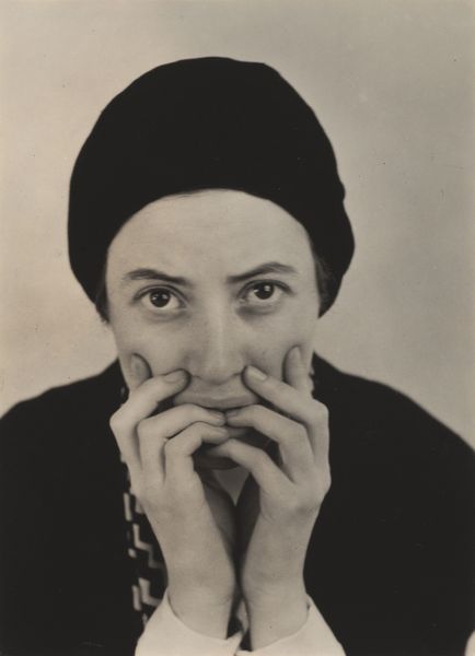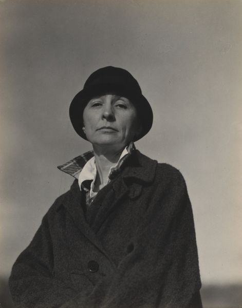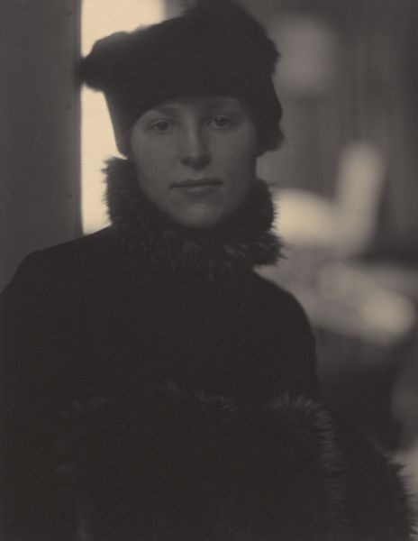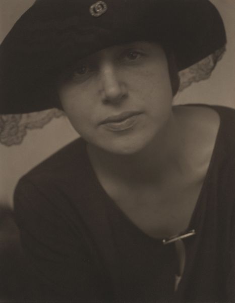 Editor: This is Alfred Stieglitz's photograph, "Georgia O'Keeffe at 291," taken in 1917. The black and white portrait possesses an incredibly intimate quality. What strikes me most is the direct, yet almost melancholic, gaze of O’Keeffe. What do you see in this piece? Curator: I see a carefully constructed icon of early modernism. Consider the background—a swirling vortex of gray, suggesting both the dynamism and the potential chaos of the era. O'Keeffe's face, framed by the hat, is a study in contrasts. Do you see how the softness of her features plays against the sharp angles of the hat? Editor: I do. The hat is casting a shadow, it draws attention to her eyes… the longer I look, the more somber she appears. Curator: Exactly. Stieglitz uses light and shadow not just to depict her, but to evoke a sense of inner depth and complexity. Think about the cultural context. This was a time of immense change, and O’Keeffe was becoming a symbol of the independent woman artist. Stieglitz is carefully crafting that image, emphasizing her strength, but also hinting at vulnerability. What message do you think Stieglitz wanted to transmit through O'Keeffe? Editor: That is a fascinating question! Maybe he intended for people to acknowledge O’Keeffe's presence as both a strong and complicated figure within the art world, at a time when women were not always acknowledged. Curator: Precisely. And it reminds us that photographs aren't just documents. They are powerful statements that reflect both the subject and the maker, as well as the values and beliefs circulating in culture. Editor: Thank you for that insight! I am definitely looking at this photograph from a new perspective. Curator: My pleasure. It's always rewarding to consider the layers of meaning embedded in visual symbols.