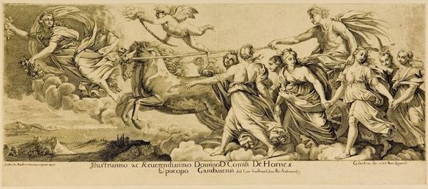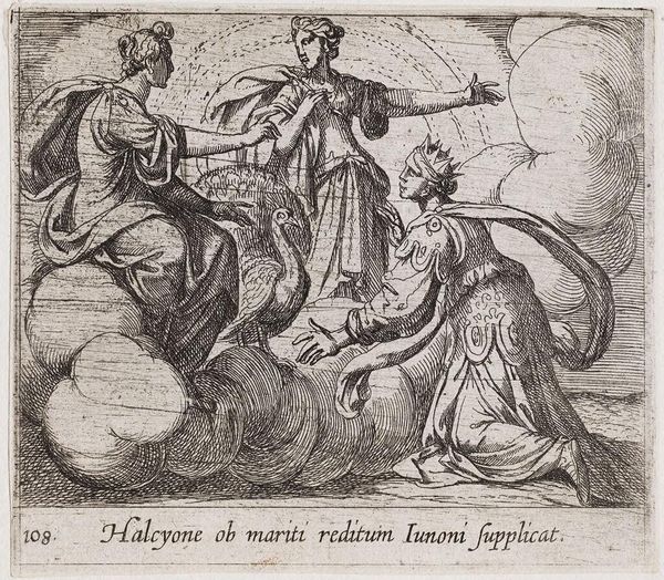 Editor: This is Antonio Tempesta's "Anius's Daughters Changing into Birds." I'm struck by the dynamic composition, the way the figures seem to be in a state of transformation. What are your thoughts on the visual elements at play here? Curator: The power of this print lies in the artist's command of line. Observe how Tempesta uses hatching and cross-hatching to create tonal variations and a sense of depth, despite the limited color palette. Note also how the artist created movement through the positioning of the figures. Editor: Yes, the texture created by the lines really enhances that sense of movement and change. Curator: Precisely. The formal elements work together to convey a scene of metamorphosis and flight. Editor: I see it now, it's like the lines themselves embody the transformation. Thank you. Curator: A close analysis reveals the artistry embedded in its visual language.