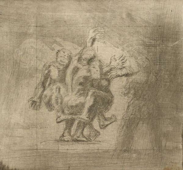 Curator: This delicate etching, entitled "Sonett," was completed in 1978 by Rudolf Láng, utilizing ink on paper. What’s your first impression? Editor: Ethereal. Almost like a dreamscape. The figures are there, but faded, as if recalled from a memory. It seems the artist uses the etching process to create tonal variation through controlled corrosion, right? Curator: Indeed. Láng's work consistently uses this etching method to construct romantic, often melancholic scenes. The landscape, rendered through subtle variations in ink density, becomes a stage for figures reminiscent of a bygone era. Editor: Looking at the material choices, paper as the foundation, ink painstakingly etched… How did those processes enable Láng to translate these observations, these scenes? The softness achieved is so unique. It allows for narrative, yet feels inherently unstable, a bit like memory. Curator: He seemed fascinated by the inherent relationship of temporality within a romantic landscape; the fleeting beauty and subsequent labor and commodification that occurred when the artwork was received by an audience. The paper itself—a manufactured material—contrasts with the natural setting. How does the work create tension? Editor: Tension in the very figures themselves. Their poses are graceful, almost aristocratic. What's their relationship to this slightly wild, untamed space? What meaning do we glean by recognizing these stark juxtapositions? Also, how does the bird, enclosed in its cage, contribute to a structural dialogue between what is contained and uninhibited in its design? Curator: Well, think of how landscape was often used to establish identity and social standing. What the composition also obscures is the true social fabric that the romantic era idealized—its production through manual, oft exploitative means. The artist hints at, but stops short of condemning it, opting instead for a romanticized re-interpretation. Editor: The material execution—the physical labor of etching combined with the symbolic romantic theme feels particularly potent in how that history is viewed. Overall, this offers us an interesting glimpse into Láng's perception of not just narrative, but production within that landscape, what he might suggest in combining both medium and subject.