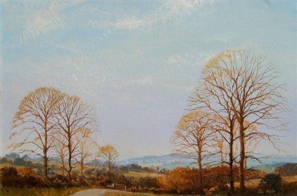 Editor: We’re looking at Ivan Eyre’s "Snow Landing," an oil on canvas created in 1981. It depicts a winter landscape. The earthy tones contrasted with the snowy fields create an interesting, almost dreamlike quality. What stands out to you as you view this piece? Curator: I’m drawn to how Eyre captures the liminal space between seasons. The painting, although representational, evokes memory more than reality. Note how the "snow landing" is not merely a depiction of snowfall, but a symbolic gesture. It’s almost a baptism, isn’t it? A cultural reset enacted by nature itself, wiping clean the slate. What feeling does the repeated band of trees evoke in you? Editor: A sense of rhythm, perhaps? Almost like musical notes on a staff. They do look similar to rows of planted headstones though, now that you point it out. How might that affect how one views the painting? Curator: Exactly. Notice the rows almost evoke an imagined sacred place or memory of the past. This use of horizontal registers can remind us of Byzantine Iconography, of painted altarpieces from centuries ago, a space for cultural projection onto the canvas. How does that association inform our viewing of a snow-laden prairie landscape? What symbolic weight is added by visually alluding to traditional, sacred forms? Editor: I see what you mean. The cultural memory embedded in the landscape suddenly becomes much more prominent. Eyre transforms a simple scene into something resonant with layers of meaning, tradition, and time. It's interesting to think of the landscape itself becoming a sacred space in a modern context. Curator: Indeed, we begin to see this artwork holding both secular and sacred spaces simultaneously and the cyclical nature of how history repeats. Thanks for bringing your observations; they enriched our discussion significantly.