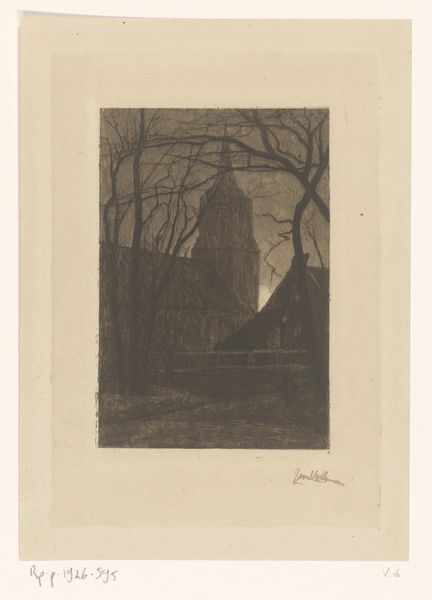 Curator: Here we have Jo Bezaan’s 1922 etching, “Rhenen.” What strikes you about it? Editor: Immediately, a stillness. The monochromatic palette coupled with the precision of the etched lines evoke a quiet reverence for this Dutch cityscape. I'm drawn to the tree that dominates the frame; it makes me think of a Japanese woodblock print somehow. Curator: Yes! The artist’s control over light and shadow gives a kind of solidity to what might otherwise feel very fleeting. The tree’s silhouette does command the foreground, acting almost like a theatrical curtain framing the tower beyond. It’s interesting how Bezaan simplifies the architecture and flattens the perspective, pushing towards abstraction but still maintaining a sense of place. I wonder, why Rhenen? What meaning did this place hold? Editor: Rhenen, a small town, was historically significant. Heavily fortified in the past, but also strategically vulnerable because of its position on the Rhine. During the Interwar period when Bezaan created this, anxieties around borders and national identity were certainly acute in Europe. Choosing such a charged, if seemingly picturesque, site feels... poignant, if perhaps not intentional. What's visible is a very traditional Dutch landscape; but perhaps we are to remember all that lurks behind it? Curator: It makes me wonder, then, if this wasn't just an aesthetic rendering of Rhenen, but maybe also a psychological one—a probing of the spirit of a place shaped by historical tension. There’s also a graphic quality to the work; look how the stark geometric shapes of the buildings contrast with the organic forms of the trees! This echoes similar visual experiments among the members of De Stijl around the same time, even if the end results are very different.. Editor: Exactly! I can see that tension between form and representation, between the concrete and the ephemeral, mirroring the anxieties of a time wrestling with its past and its future. I’d even say this image captures a uniquely Dutch ethos. Rooted in its soil, solid like its buildings—but always, subtly threatened. Curator: A fittingly understated sentiment, given the nature of the artwork itself, then! I will be thinking about all the past layers that still sit beneath the surface of this image. Editor: Precisely. I’m grateful this image reminds me to look harder, past surface appearances, to see what histories are embedded there.