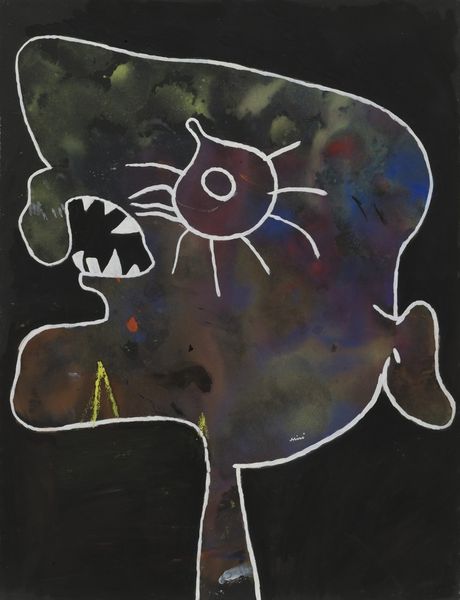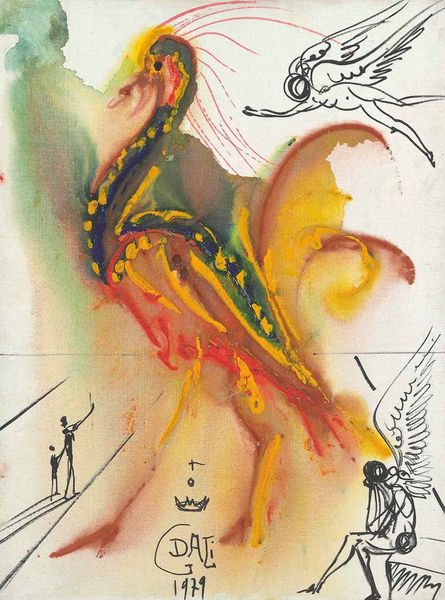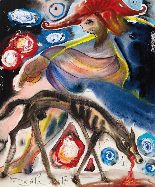 Curator: Salvador Dalí's 1966 watercolor, "Femme voilée avec un turban bleu et lampe allumée," immediately evokes a sense of mystery. What’s your initial reaction? Editor: A veiled figure, shrouded in…chlorophyll? It's this intriguing combination of opulence—a jeweled turban, the magic lamp—and earthy, almost decaying, greens that strikes me. The materials and colors give it a strange textural ambiguity, is it shimmering silk or wet vegetation? Curator: Dali often juxtaposed disparate elements to create dreamlike scenes. Consider how "orientalism," a very specific style in art history, intersects with his well-known surrealist tendencies here. There's a Western gaze filtered through his own distinct lens. Editor: Absolutely. That blue turban reads like both a signifier of the "Orient" for a European audience, and a mass-produced cultural object easily consumed in his time. The veil obscures identity, commodifying an idea rather than portraying an individual. Is that metalwork adding relief? It's such a collage of visual and material tropes. Curator: The veil does much more than obscure. It invites speculation. We look through a keyhole into an imagined world, a carefully constructed persona. Dalí played with such archetypes throughout his career, inviting audiences to confront their own fantasies. Editor: Yes, but I find myself thinking about the making of the piece itself, the labor involved, the actual watercoloring... those thin washes over what looks like heavier metal details disrupt the smooth fantasy a bit. It's not a seamless dream, is it? It's obviously, materially, *made*. Curator: That's Dalí for you – both illusionist and provocateur. It questions what the social role of imagery really represents, don’t you think? Editor: Definitely food for thought. The tension between allure and construction certainly adds layers to its charm. Curator: Indeed, thank you for your perspective!