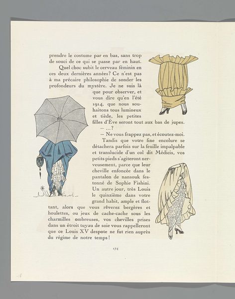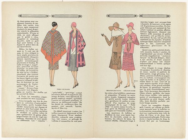Curator: Here we have a fashion illustration by Paul Mėras, from the "Gazette du Bon Ton" in 1914. It’s entitled "Loge de la Cape." Editor: Immediately, I see echoes of theatrical costumes—the poses, the drapery... it's all very stage-like. A bit mysterious, don’t you think? Curator: Absolutely! The "Gazette" was hugely influential at the time, presenting fashion as art and reflecting the shifting roles of women. Mėras here is documenting how these designs embody and negotiate societal expectations. Editor: You can really read a lot into the symbolism. The cape, as the text indicates, almost harks back to Eve, shrouded and banished, and the art nouveau stylization reinforces this link to primordial images. Each rendering feels like a meditation on protection and revelation. Curator: Indeed. Think of the timing—just before the Great War. The cape perhaps provided a sense of protection during an unstable and dangerous era. What's interesting is how this publication played a pivotal role in shaping the couture industry in spite of these conditions. Editor: I agree. There’s a strong feeling of longing woven through these illustrations. These figures stand outside reality – existing instead within an ideal state that I would argue offers protection from outside torments. Curator: Fascinating how something seemingly frivolous can have such a deeper cultural resonance. Editor: And perhaps that is the essence of fashion, after all – weaving narrative into the everyday, imbuing textiles with myth. It is an insightful view of dress and its symbolism in troubled times.