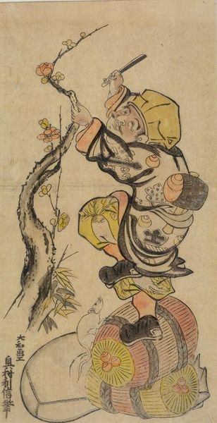 Editor: This is Utagawa Hiroshige's "The Kōya Jewel River in Kii Province," from his series "Six Jewel Rivers." It feels very serene, with that waterfall and the woman crossing the bridge. What symbolic meaning do you find embedded within this print? Curator: The jewel river, or "Tamagawa," is a recurring motif in Japanese art and poetry, often linked to purity and the passage of time. How does the figure crossing the bridge, burdened with what seems to be tools, interact with this symbolic river? Editor: I guess she’s a part of the landscape, her journey echoing the river’s flow, and that bundle could be a connection to labor. Curator: Precisely! The bridge isn't just a physical crossing, but a symbolic threshold. Does the woman’s placement, almost dwarfed by the natural elements, tell us something about humanity’s role in this landscape? Editor: Maybe it's a reminder of our small place in the face of nature’s grandeur. Curator: Indeed. The symbols intertwine to offer a narrative of nature and humanity, the transient and the timeless.