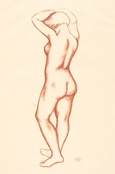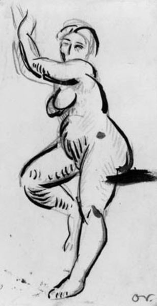Curator: This drawing, "Figurgruppe. To stående kvindelige modeller, en face og rygvendt," was created by Othon Friesz between 1908 and 1909 and resides here at the SMK, Statens Museum for Kunst. Editor: Immediately, I'm struck by the rawness of the lines, the unadorned depiction of the figures. There's an intimacy here, wouldn't you say? It's not idealized. Curator: Yes, I think that speaks directly to the conditions in which Friesz and others in the Post-Impressionist movement operated. There was less focus on classical ideals, instead an interest in exploring form and representing everyday life as it was seen and felt. I find it so refreshing that the artist emphasizes materiality: raw charcoal meeting paper. Editor: The deliberate use of charcoal lends itself well to representing the bodies themselves. This period witnessed profound social shifts and evolving perceptions of the female body. This drawing reflects this shift. Curator: The drawing material itself, charcoal, of course, implies a level of preparation; and there would have been considerations for sourcing such materials. But it is very common medium, accessible. As well as it being a common sketching medium it can suggest ideas such as ephemerality and urgency in its ease of use. The use of drawings to then plan and produce works like sculpture and paintings would have influenced choices to capture studies as fast as possible for the needs of a productive atelier. Editor: Exactly, in the context of early 20th-century societal norms and artistic conventions, Friesz’s figuration might have been read in terms of the avant-garde’s break from established aesthetics. These images contributed to evolving representations of the female body and sexuality. The use of materials like charcoal could have emphasized the everyday or challenging expectations of high art and who it served. Curator: Seeing the artist working through these studies, trying out compositions. One thinks also of the societal changes going on around the figures who were being drawn and of those who were involved in the drawing. It is all part of a collaborative human process. Editor: Indeed, stepping back and seeing these not just as isolated images but within this much broader historical perspective gives such valuable insights. Curator: Yes, it shows art's relationship to a particular place, person, and time.