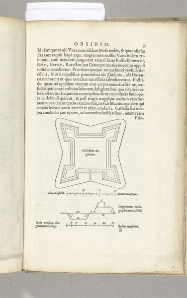 Editor: Here we have "Plattegrond en doorsnede van Friese en Hollandse forten tijdens het beleg van Bergen op Zoom, 1622," a print and etching made on paper between 1627 and 1629 by Franciscus van Schooten. I find it remarkable how this evokes an almost mathematical or diagrammatic mood. What do you make of it? Curator: It reminds me of staring at blueprints as a kid, imagining grand adventures within those walls. Schooten's etching, though, freezes a specific historical moment. He hands us the strategic keys to these forts defending Bergen op Zoom during a critical siege. The sharp lines detailing the layout almost make it feel more like a puzzle or game than a desperate battle. Do you feel the geometric rigidity contrasting with the chaos of warfare? Editor: Absolutely. It's like seeing war through a very detached lens. It's intriguing how technical it is, almost clinical, when we think of the human drama that unfolded within these star-shaped fortifications. I wonder if that's a deliberate choice by Schooten. Curator: It definitely begs the question. Perhaps by mapping it out so precisely, he’s also suggesting an underlying order amidst the chaos. This precision, the measured scale, suggests an attempt to control the narrative. To impose reason on what must have been an exceptionally irrational time. I love how such an unassuming image opens up such rich terrain. Editor: It's amazing how much a seemingly straightforward diagram can reveal about both the practical and psychological aspects of a historical moment. It makes you think differently about history itself. Curator: Exactly! It reminds me that history isn't just dates and names, it's about understanding perspectives and intentions, even within a seemingly objective bird’s-eye view of a battlefield.