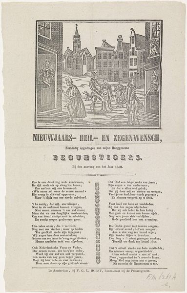 Editor: This print, dating from around 1840-1870, is titled "Nieuwjaarswens van de torenwachters van de Westerkerk te Amsterdam," or, “New Year's wish from the tower watchmen of the Westerkerk in Amsterdam." It’s… surprisingly festive, even considering it’s a New Year's greeting. What strikes me most is how it captures a specific sense of civic life. What do you see in this piece, beyond just a charming cityscape? Curator: It’s more than just charming, it's a piece of social commentary embedded within a cultural practice. These “nieuwjaarswensen,” printed on textiles often, were essentially early forms of public service announcements intertwined with charity. The tower watchmen, symbols of civic vigilance, were literally appealing to the citizens. Notice how the architecture itself—the Westerkerk— looms large, representing not just a building, but the institutions it embodies. The poem surrounding it, how does that function in your view? Editor: I suppose it's the actual "wish," the explicit expression of hope and good fortune. But I'm also curious about the street scene itself – those figures seem placed almost deliberately, right? Curator: Exactly. Consider the class dynamics at play. You have the watchmen interacting, perhaps even soliciting funds, from citizens of varying social standing. It’s a performance of sorts, highlighting the hierarchical, often unspoken, relationships within the city itself. And it's being circulated publicly, reminding everyone of these roles and responsibilities. Do you think this kind of public display solidified social order? Or perhaps challenged it? Editor: Hmm… maybe a bit of both? Reinforcing the order through its display of the current hierarchy but it seems like providing such display would invite, implicitly, the consideration of how those hierarchies can be upended, since what has been built up can always be taken down. It has been really great looking at this piece. I'll look into these textiles and the implications on social interactions and class going forward. Thanks for the insight! Curator: My pleasure. Remember that even seemingly simple images like these are products and reflections of their social world. Keeps digging below the surface!