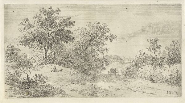 Editor: We’re looking at "Duinlandschap," or "Dune Landscape," a pencil drawing by Anthonie van den Bos, created sometime between 1778 and 1838. It’s a fairly simple scene, rendered in delicate lines, but there's a quiet stillness about it. What do you see in this piece that might go beyond just a landscape? Curator: The first thing that strikes me is the contrast between the two small groups of figures. You have, on the one hand, a figure seated with a dog – perhaps representing contemplation, a communion with nature. And then on the other side, the figures gesturing out into the distance. There's a subtle tension isn’t there? It evokes this duality between the introspective Romantic gaze, seeking solace and understanding from the land itself, versus an outward-looking ambition. Editor: I hadn’t really noticed that contrast, but now that you mention it, it's quite striking. The lone figure almost blends into the landscape, while the others are separate from it. Is it unusual to include such details in a landscape drawing of this period? Curator: Not necessarily, but their positioning and symbolic weight are intriguing. The lone figure reminds us of the “wanderer above the sea of fog” motif. Do you know that work? The idea of humanity’s small place within the sublime vastness of nature, a common trope in Romanticism. Perhaps Van den Bos is exploring something similar here, only with the addition of community, the pair of travellers on the opposite side, making their way across the land together. Editor: So the landscape isn't just scenery, it’s more about how people relate to the natural world and each other. Curator: Precisely. Consider how the artist employs delicate strokes of graphite. Do you think this infuses the image with melancholy or longing? Perhaps he seeks to represent universal experiences across cultural memories and intimate human narratives. Editor: It gives the drawing an emotional resonance that I didn’t appreciate at first. It's like looking into someone’s memory of a place. Thanks for pointing all this out! Curator: It’s always rewarding to uncover hidden meanings within these landscapes, and this has opened a new perspective for me too.